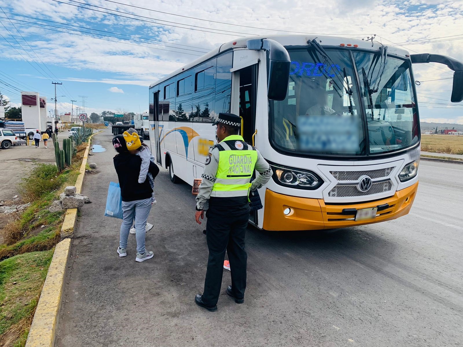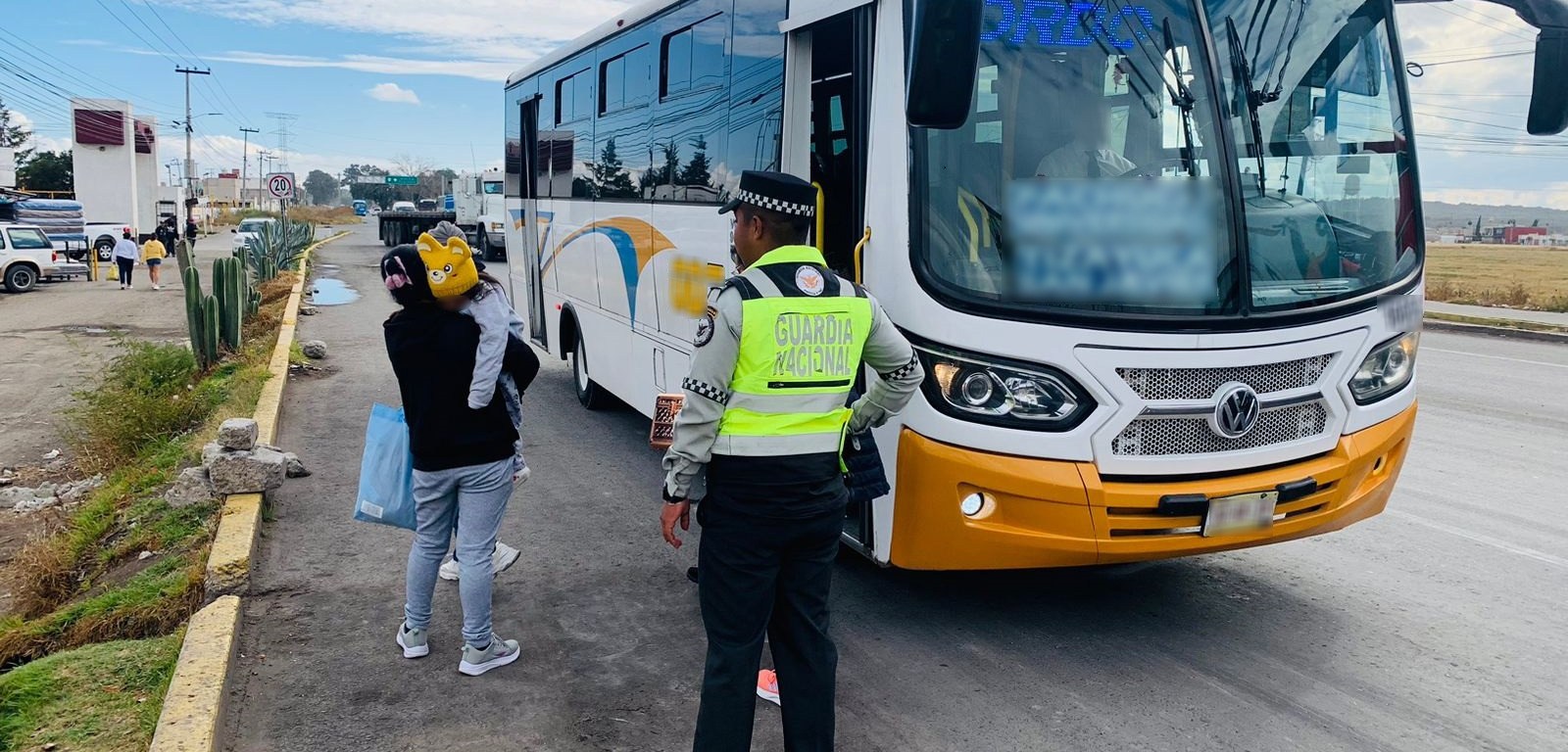 En apego al modelo de proximidad social, el personal perteneciente a la Coordinación Estatal de la Guardia Nacional en el estado de México marca el alto a las unidades del transporte público, se identifican con los pasajeros a bordo y solicitan autorización para realizar un registro de sus pertenencias, así como una inspección corporal.