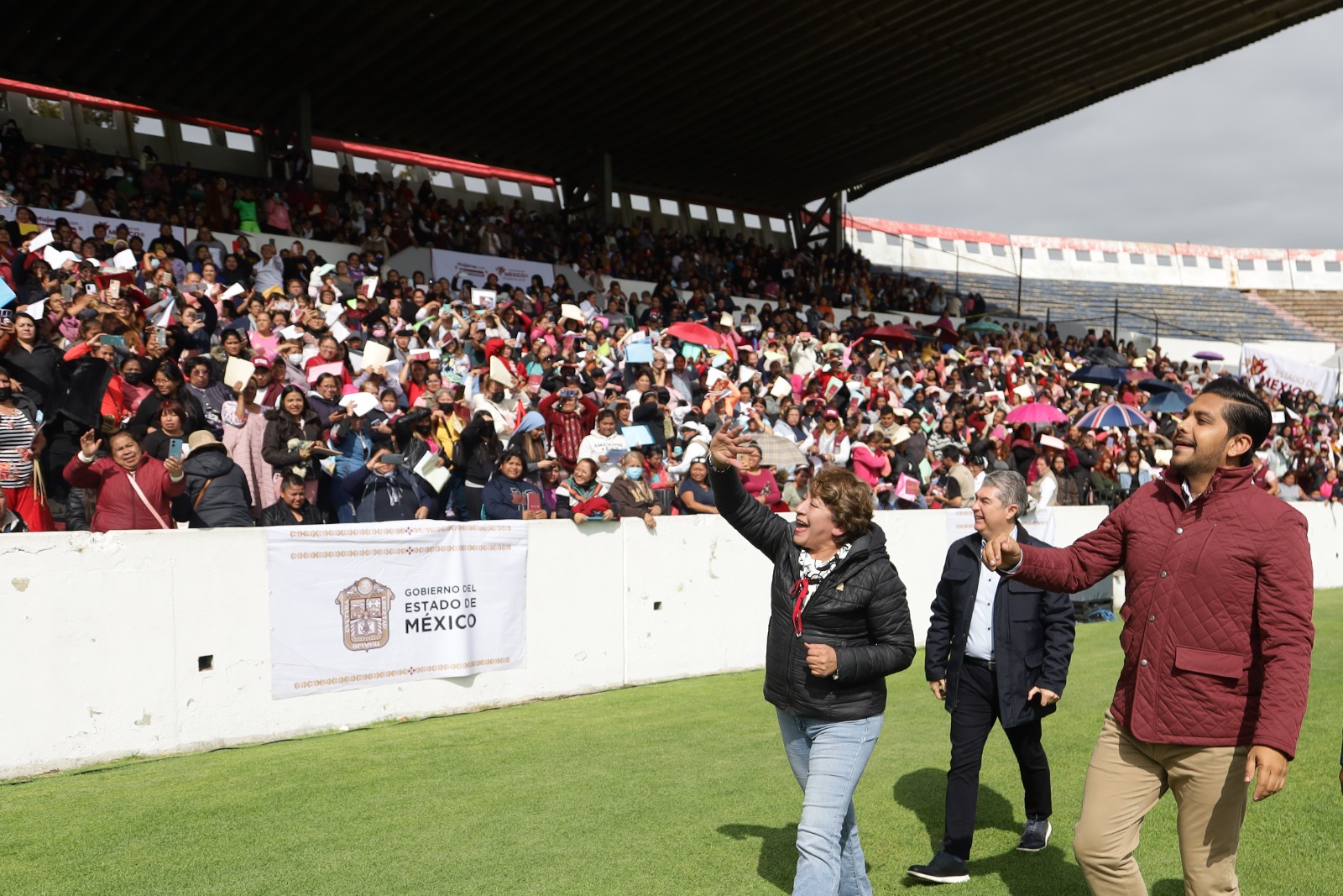 En el estadio Neza 86, donde se congregaron 6 mil mujeres habitantes de este municipio, Delfina Gómez entregó de manera simbólica cinco tarjetas a igual número de beneficiarias, quienes además podrán recibir atención educativa y de salud, pagar directamente el transporte público y acceder a servicios veterinarios para los animales de compañía y de asistencia, entre otros beneficios.