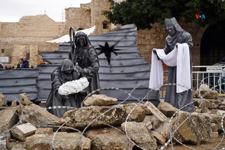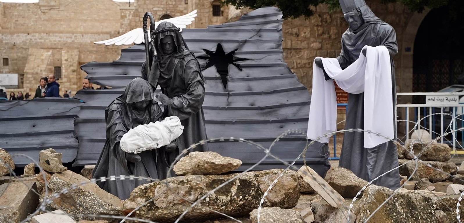 En lugar de los festejos tradicionales, se colocó en la plaza un pesebre a tamaño natural, obra del artista palestino Tariq Salsa, en el que entre rocas, escombros y alambres de espino, aparecen las tradicionales figuras de San José, la virgen María y el niño Jesús, envuelto completamente en una sábana blanca, en triste referencia a los niños enterrados a diario en Gaza.