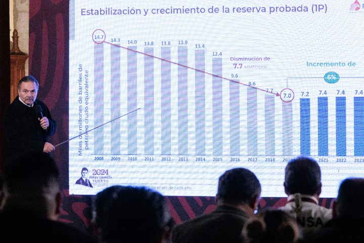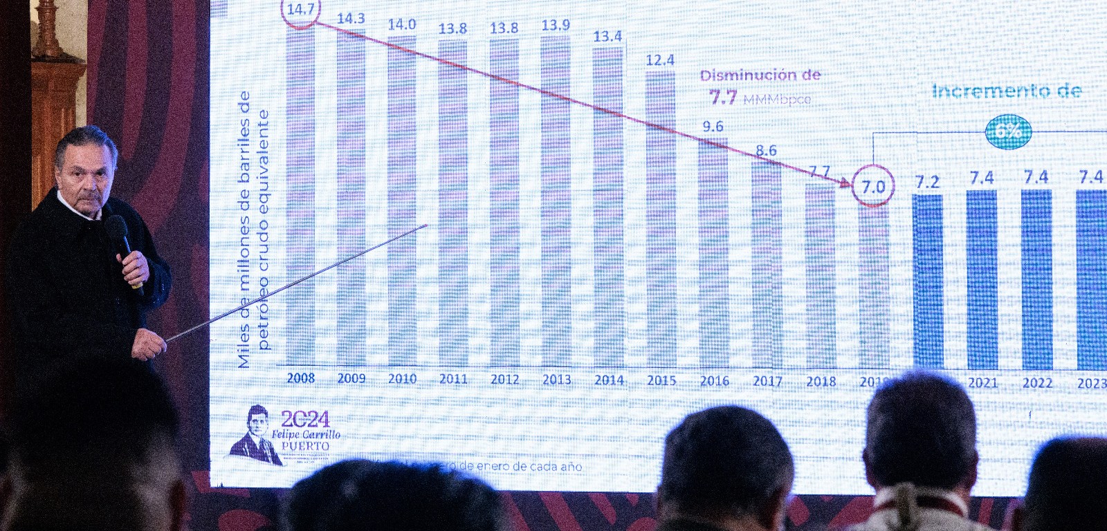 En conferencia de prensa, Romero Oropeza informó que se pasó de tener más de 14 a 7.4 millones de barriles de petróleo; mientras que actualmente existe una producción de mil 876 barriles diarios.