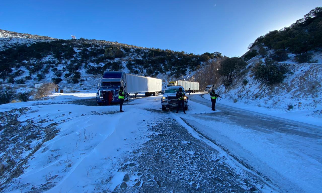 Efectivos de la militarizada Guardia Nacional (GN) mantienen operativos de seguridad y prevención de accidentes en carreteras de ambas entidades, donde se registran nevadas por la presencia de una masa de aire polar, asociada al frente frío número 25.