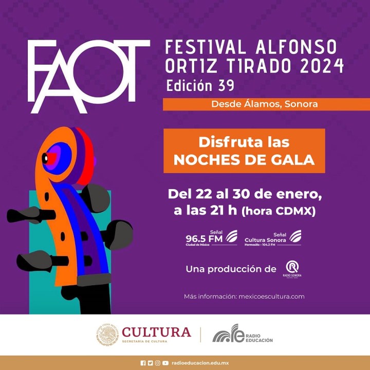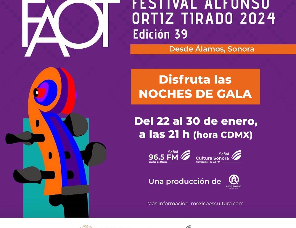 En el marco de actividades para conmemorar su centenario, Radio Educación, institución de la Secretaría de Cultura del Gobierno de México, transmitirá la 39 edición del Festival Alfonso Ortiz Tirado (FAOT) 2024, que se lleva a cabo en la ciudad de Álamos, Sonora.
