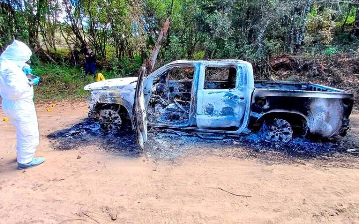 Se localizaron indicios de una camioneta incendiada y con impactos de arma de fuego en un camino cercano al municipio de San Miguel Totolapan.