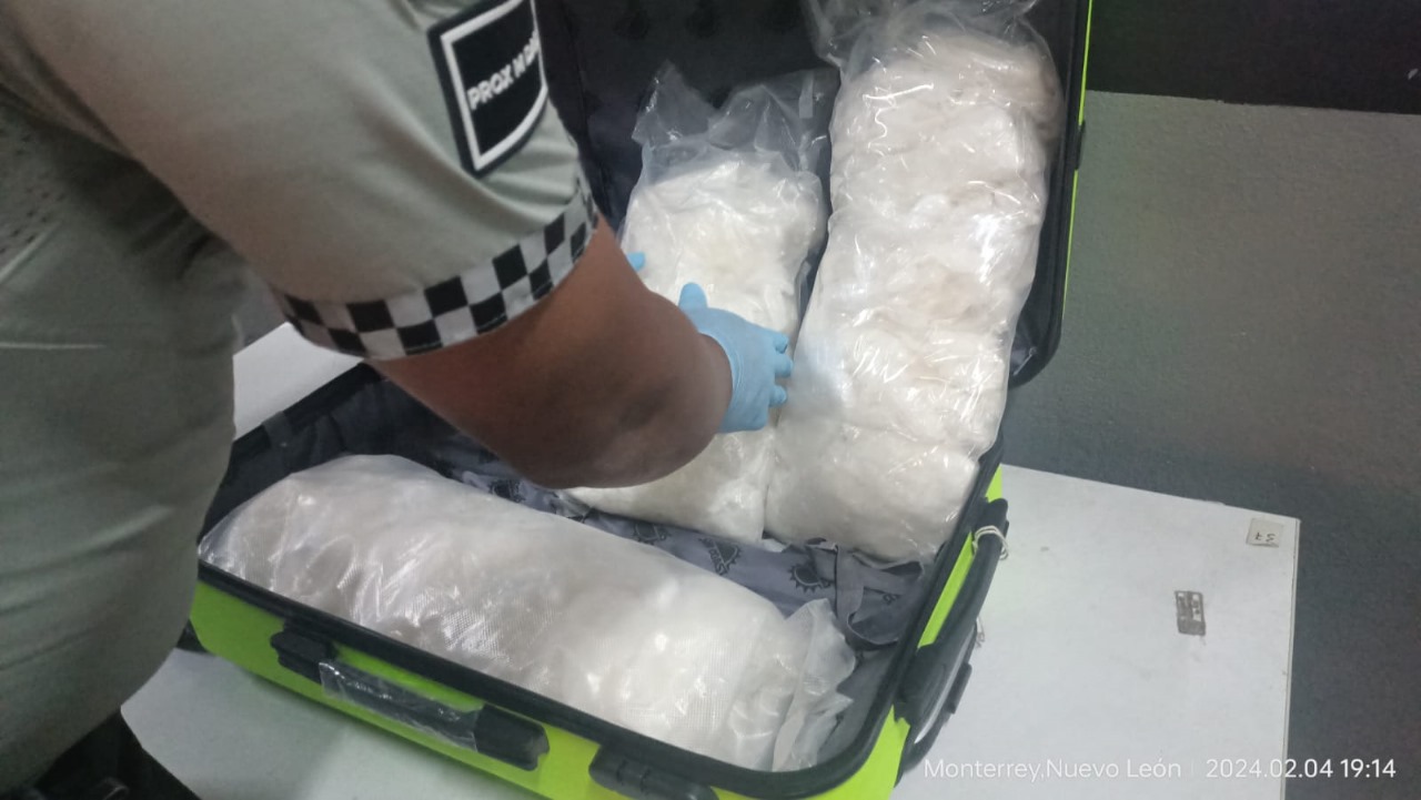 Los guardias nacionales ingresaron la maleta a una máquina de rayos X y visualizaron diversos paquetes con densidad irregular; al realizar una inspección física, localizaron en su interior 3 paquetes de plástico con una sustancia granulada de color blanco, con las características de la droga sintética cristal y un peso aproximado de 13 kilos.