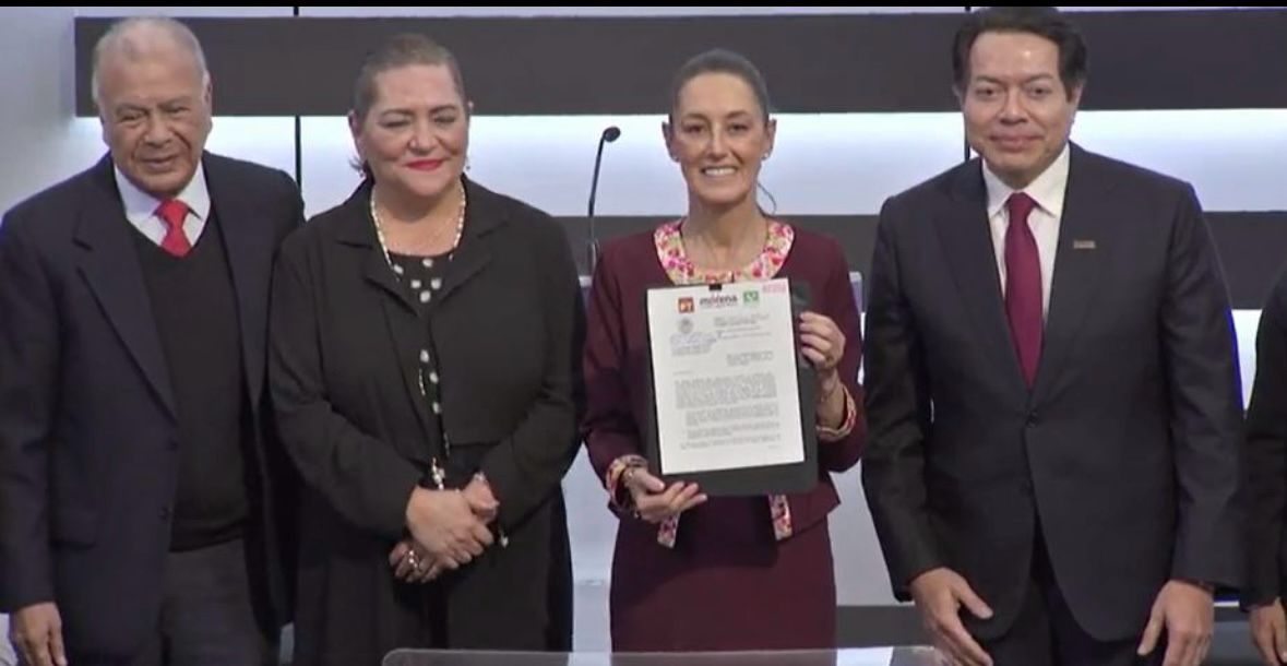 Sheinbaum Pardo estuvo acompañada por las dirigencias del Movimiento Regeneración Nacional (Morena), del Partido Verde Ecologista de México (PVEM) y del Partido del Trabajo (PT).