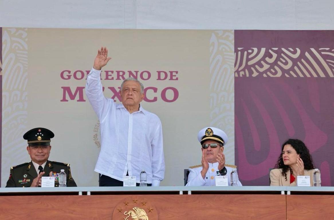 En la Explanada Rodolfo Sánchez Taboada, el presidente López encabezó el izamiento de la bandera monumental, mientras la banda de música y el coro de la Sedena interpretó Canto a la Bandera.