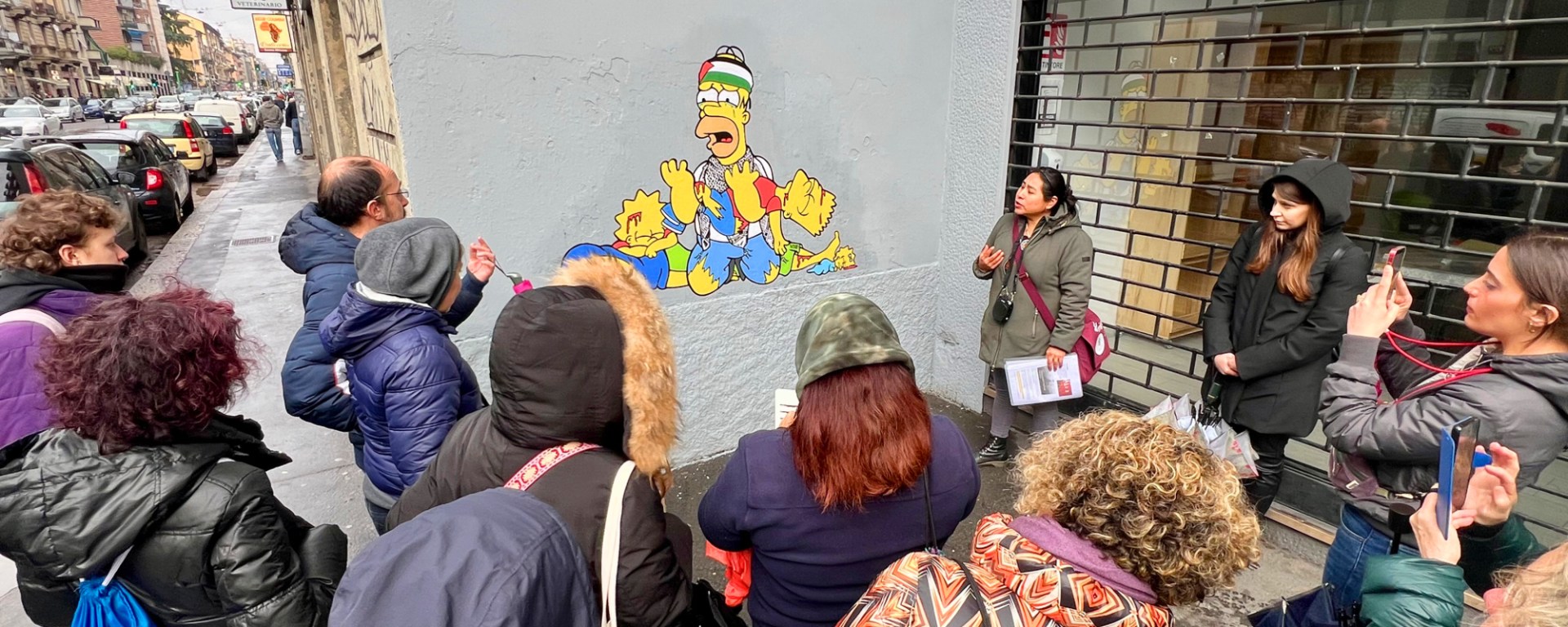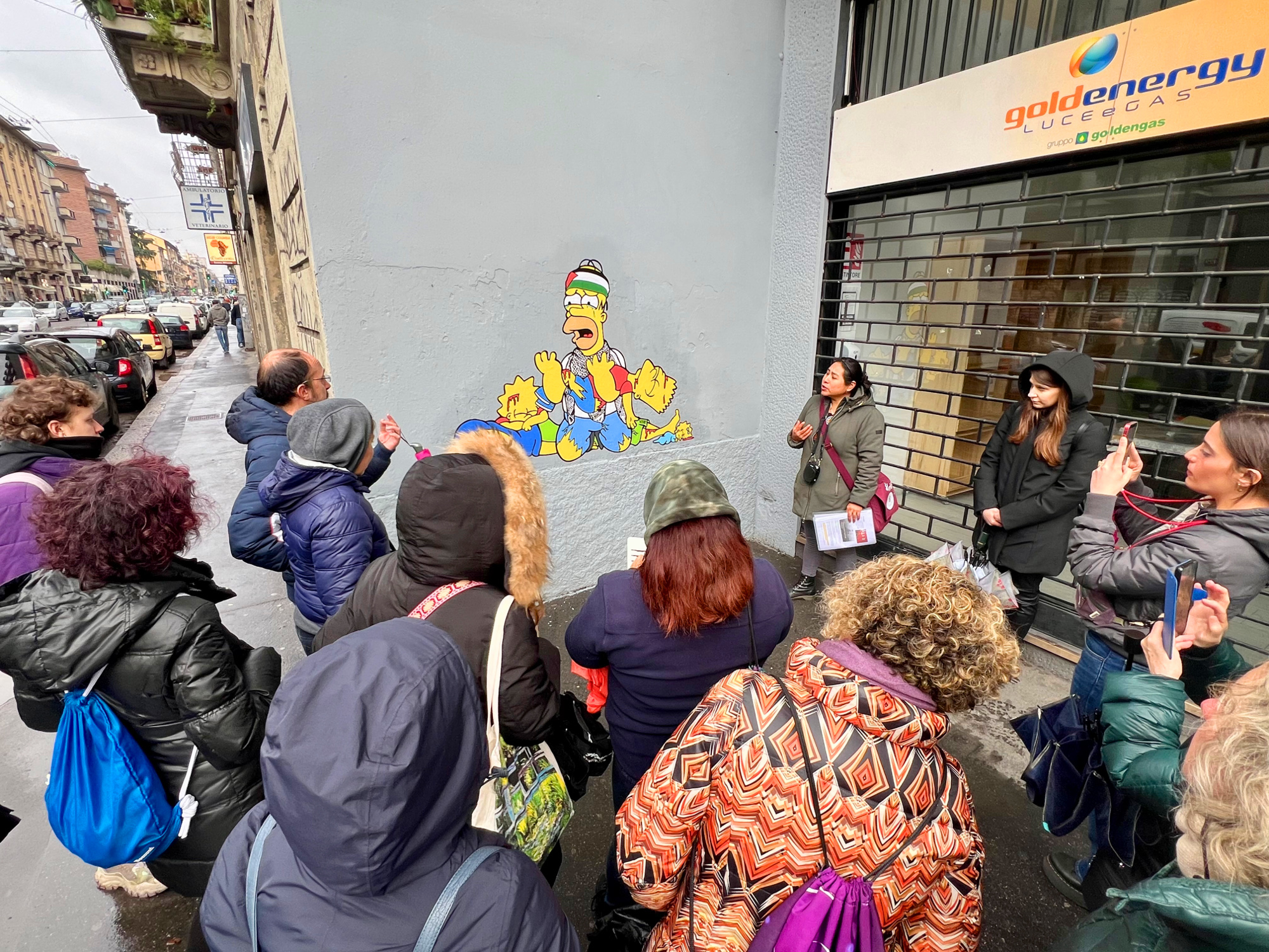 La ONG milanesa, comprometida desde hace más de cincuenta años con la cooperación internacional, la protección de los derechos humanos y la lucha contra la pobreza y la desigualdad, «decidió incluirlo en sus paseos interculturales de turismo sostenible y responsable, y fue un guía turístico de origen migrante quien acompañó a un nutrido grupo de visitantes a admirar el mural de los Simpson palestinos», reveló el artista en un comunicado.