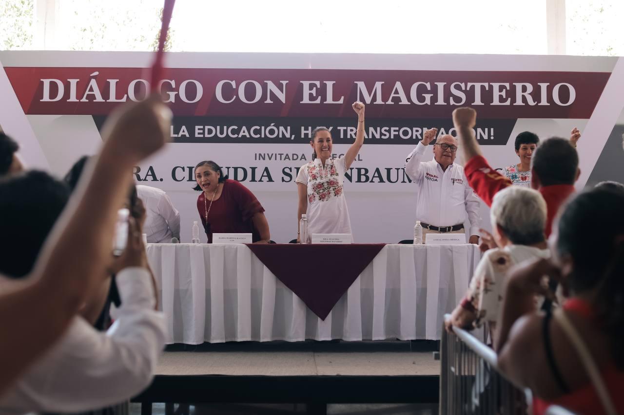 En Campeche, la aspirante presidencial por Morena, PT y PVEM dijo que se revisará el sistema por el cual se designan las plazas al magisterio.