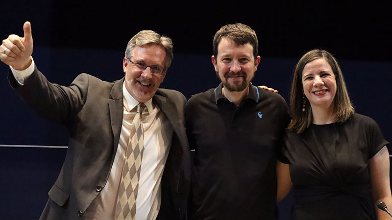 Pablo Iglesias, también ex alumno y profesor de la UNAM, detalló que la esencia de la democracia es «convertir los derechos de unos pocos, en derechos de las mayorías. Eso es la democracia. Si la democracia es un conjunto de correlación de fuerzas para definir el escenario de combate político, hay que reconocer que la democracia es un movimiento histórico de expropiación de poder de los menos, para convertir esos privilegios en derechos de los más; y eso es algo que no debemos olvidar nunca».