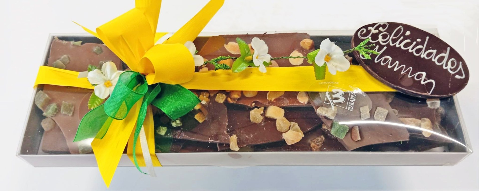 Bizkarra cuenta con otras presentaciones de regalo para el Día de la Madre, como la Caja Titanio Guggi que contiene medio kilo de chocolates combinados con diferentes ingredientes. Con ese mismo espíritu, pero en una presentación de 300 gramos, ofrece la bolsa de láminas de chocolate surtidas con una selección de las variedades de chocolate que más gustan.