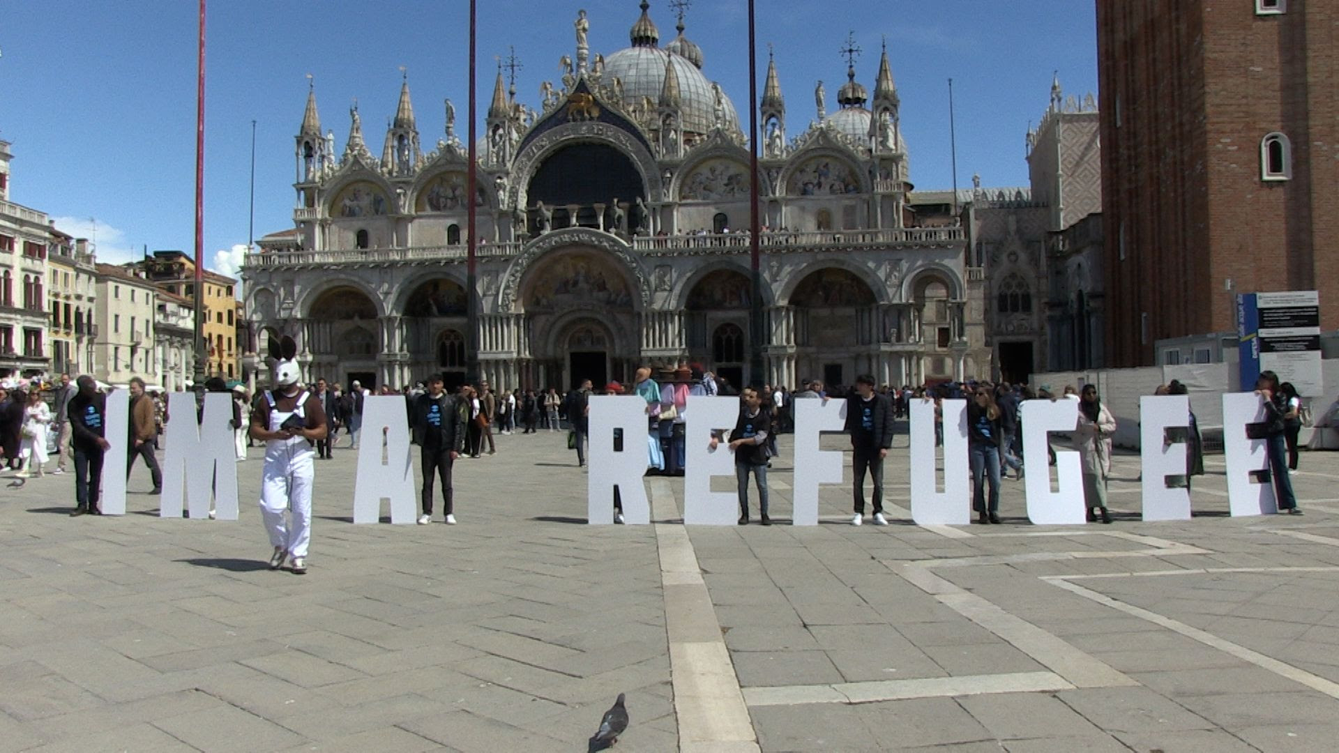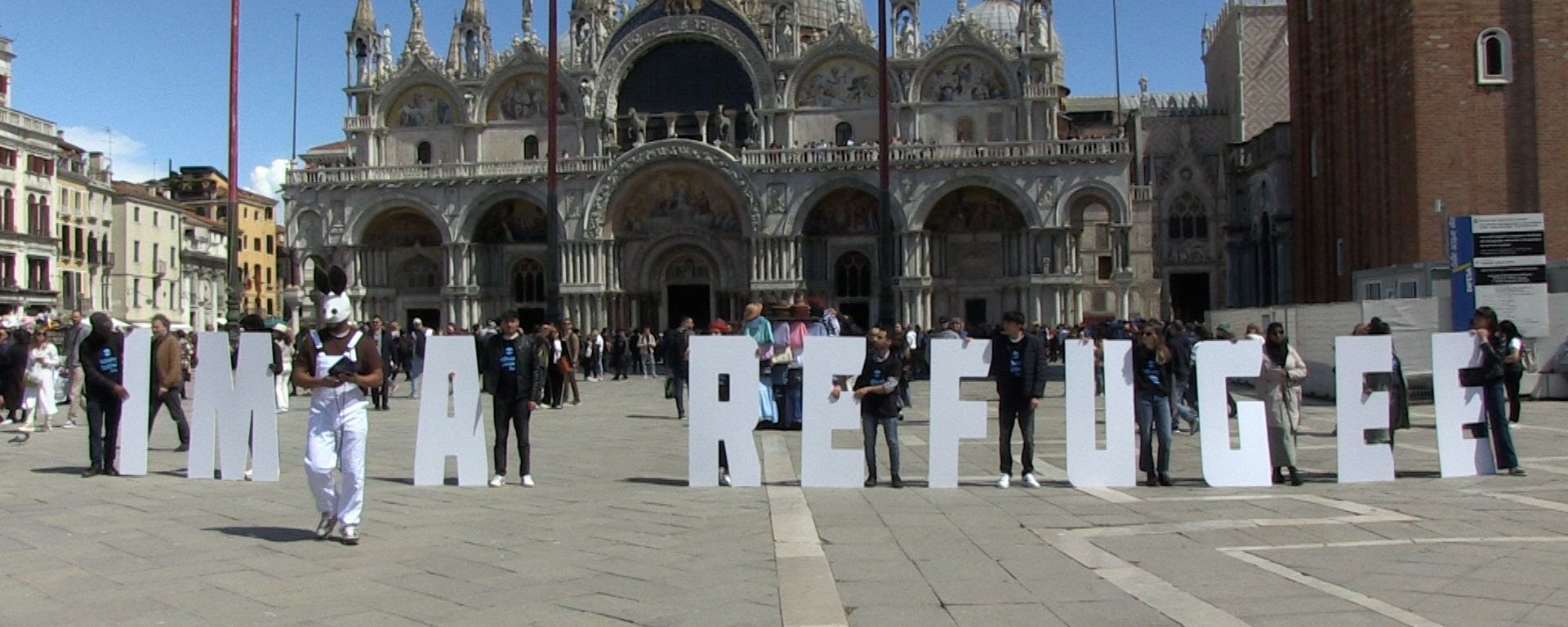 Luego, en horas de la tarde, los visitantes de la zona Giardini fueron testigos de la reinterpretación visionaria del Poema Público sobre Migración de Alain Arias Misson: con la ayuda de jóvenes estudiantes de arte, ataviados con las icónicas máscaras de conejo del colectivo, Food of War deletreó con letras a gran escala las frases «I AM MIGRANT» y «I AM REFUGEE». Y el sábado 20 de abril, el Poema Público invadió la Plaza San Marcos, esta vez con la participación de miembros de la ONG Refugee Welcome Italy. –sn–
