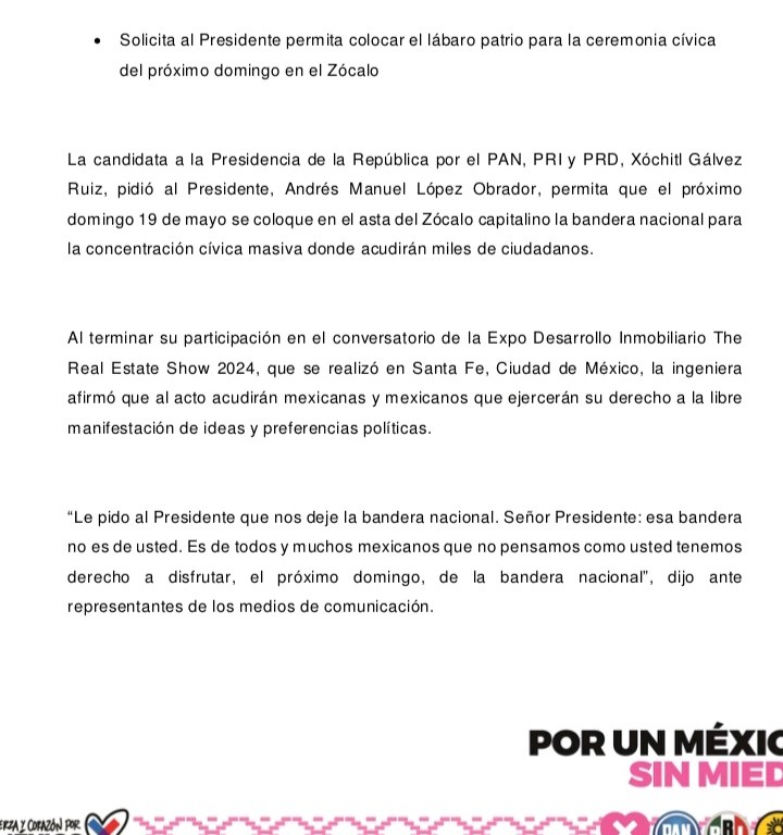 La candidata de Fuerza y Corazón por México, Xóchitl Gálvez Ruiz, pidió al Presidente, Andrés Manuel López Obrador, permita que el próximo domingo 19 de mayo se coloque en el asta del Zócalo capitalino la Bandera Nacional para la concentración cívica masiva donde acudirán miles de ciudadanos.