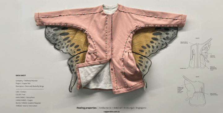La idea detrás de «Copper Skin» fue transformar el cobre, anteriormente utilizado en cables de red, en un tejido innovador que nutre y protege la piel delicada de los niños afectados por la Piel de Mariposa. Este enfoque pionero aprovecha las propiedades antibacterianas, angiogénicas y fungicidas del cobre para promover la cicatrización de heridas y mejorar la movilidad de estas personas.