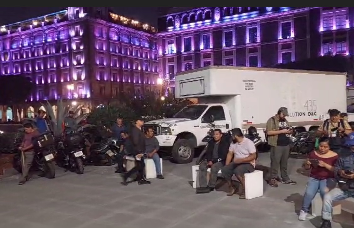 Profesores de la Coordinadora Nacional de Trabajadores de la Educación (CNTE), en plantón que mantienen en el Zócalo capitalino, impidieron el acceso de camiones con equipo para el templete que usará la candidata a la Presidencia de la República, Claudia Sheinbaum.