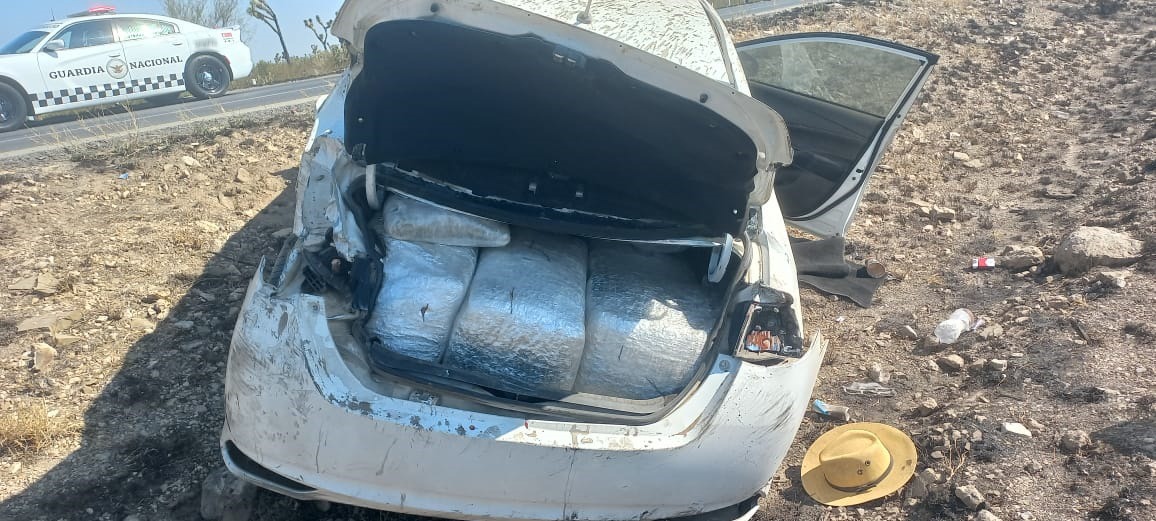 En Zacatecas, elementos de la militarizada Guardia Nacional (GN) aseguraron un cargamento de aproximadamente 50 kilos de aparente marihuana dentro de un vehículo siniestrado.