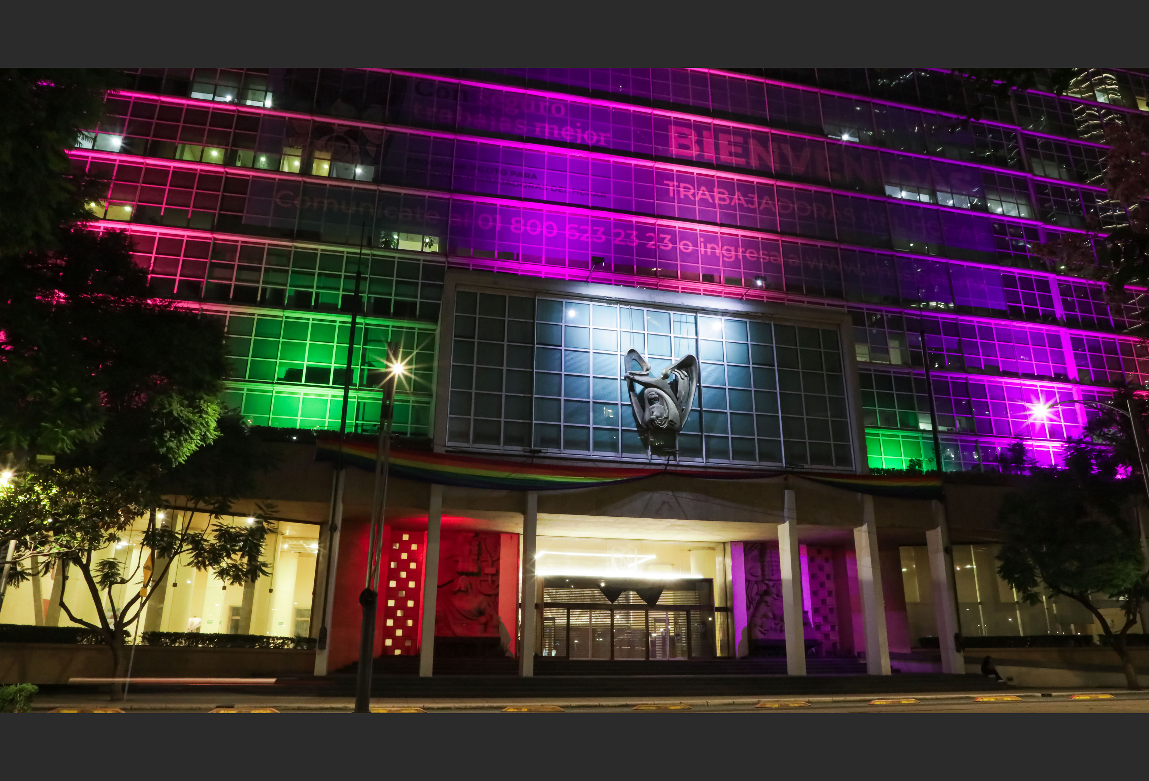 A las 19:00 horas, la sede ubicada en Avenida Paseo de la Reforma 476, Colonia Juárez, en la Ciudad de México, comenzó a lucir entre luces color rojo, naranja, amarillo, verde, azul y violeta.