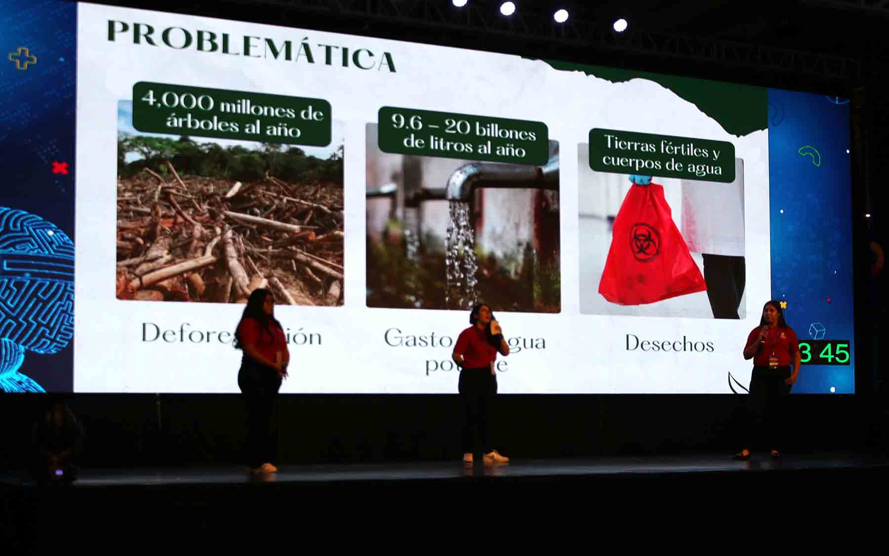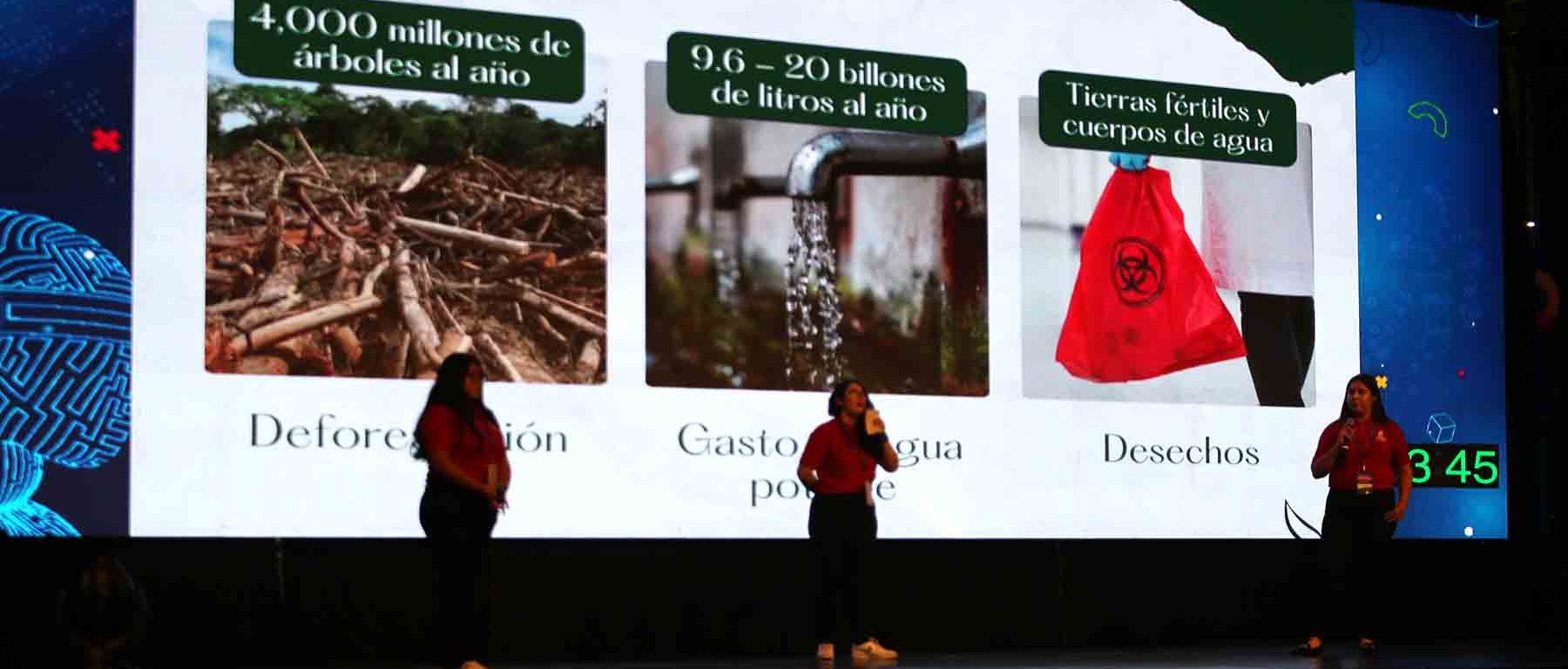 COCOTECH enfrenta el grave problema ambiental de la producción de papel. En su presentación, las alumnas expusieron que producir un kilogramo de papel consume entre 200 y 300 litros de agua potable. Anualmente se talan 4,000 millones de árboles, usando entre 9.6 y 20 billones de litros de agua.