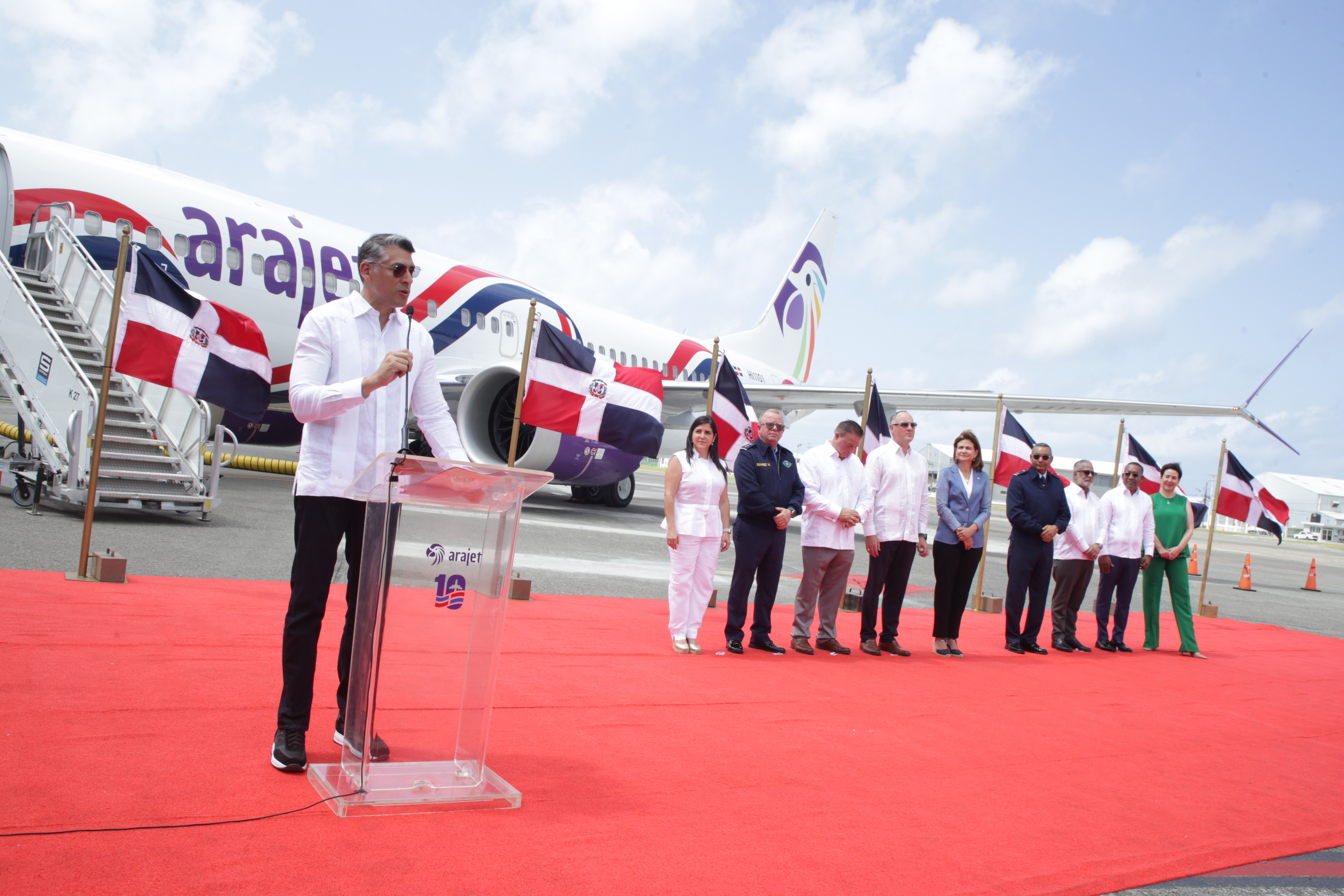 La ceremonia de recibimiento fue encabezada por la vicepresidenta de la República, Raquel Peña, y el CEO y fundador de Arajet, Víctor Pacheco Méndez. También asistió el presidente de Boeing para América Latina, Landom Loomis, entre otros funcionarios y ejecutivos de la empresa.