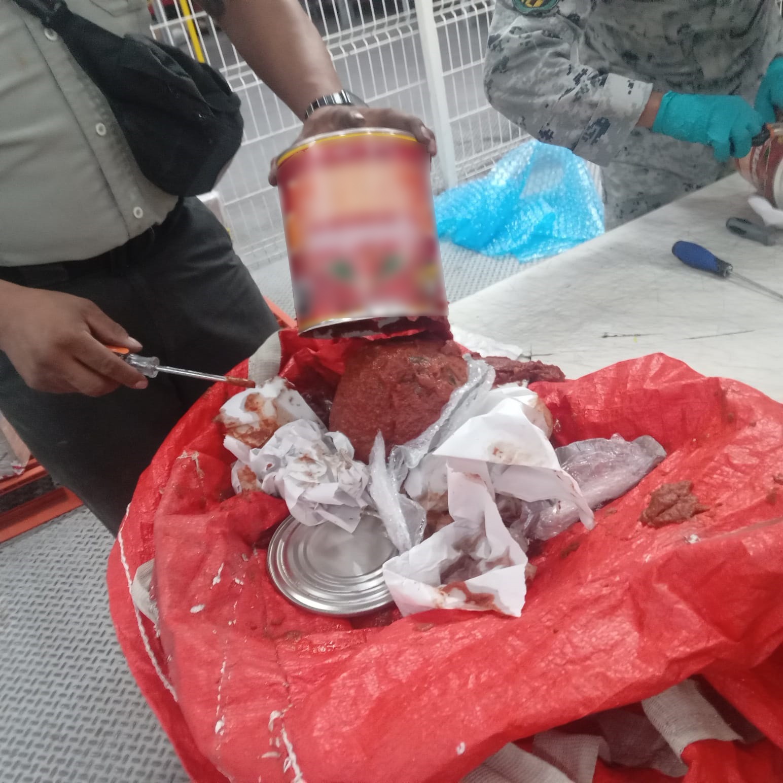 En Querétaro, integrantes de la militarizada Guardia Nacional (GN) aseguraron 12 kilos de aparente droga sintética cristal, ocultos en latas con etiqueta de salsa para pizzas.