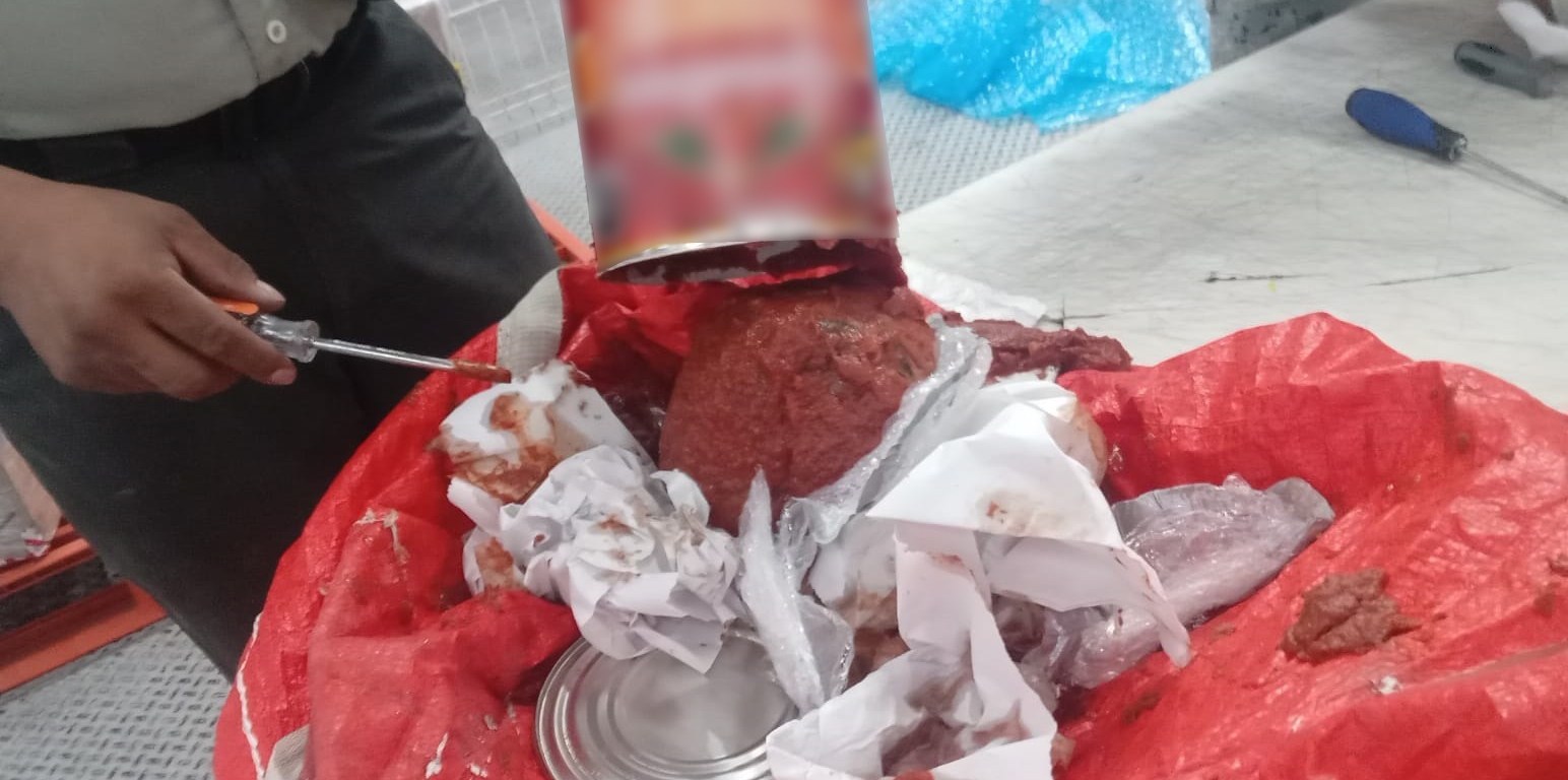 En ambas cajas, que tenían como destino un domicilio en el estado de Houston, Texas, Estados Unidos, localizaron 12 latas de metal con etiqueta de salsa para pizzas que ocultaban en su interior bolsas cerradas al alto vacío con una sustancia granulada y transparente con las características de la droga sintética cristal, con peso aproximado de 12 kilos.