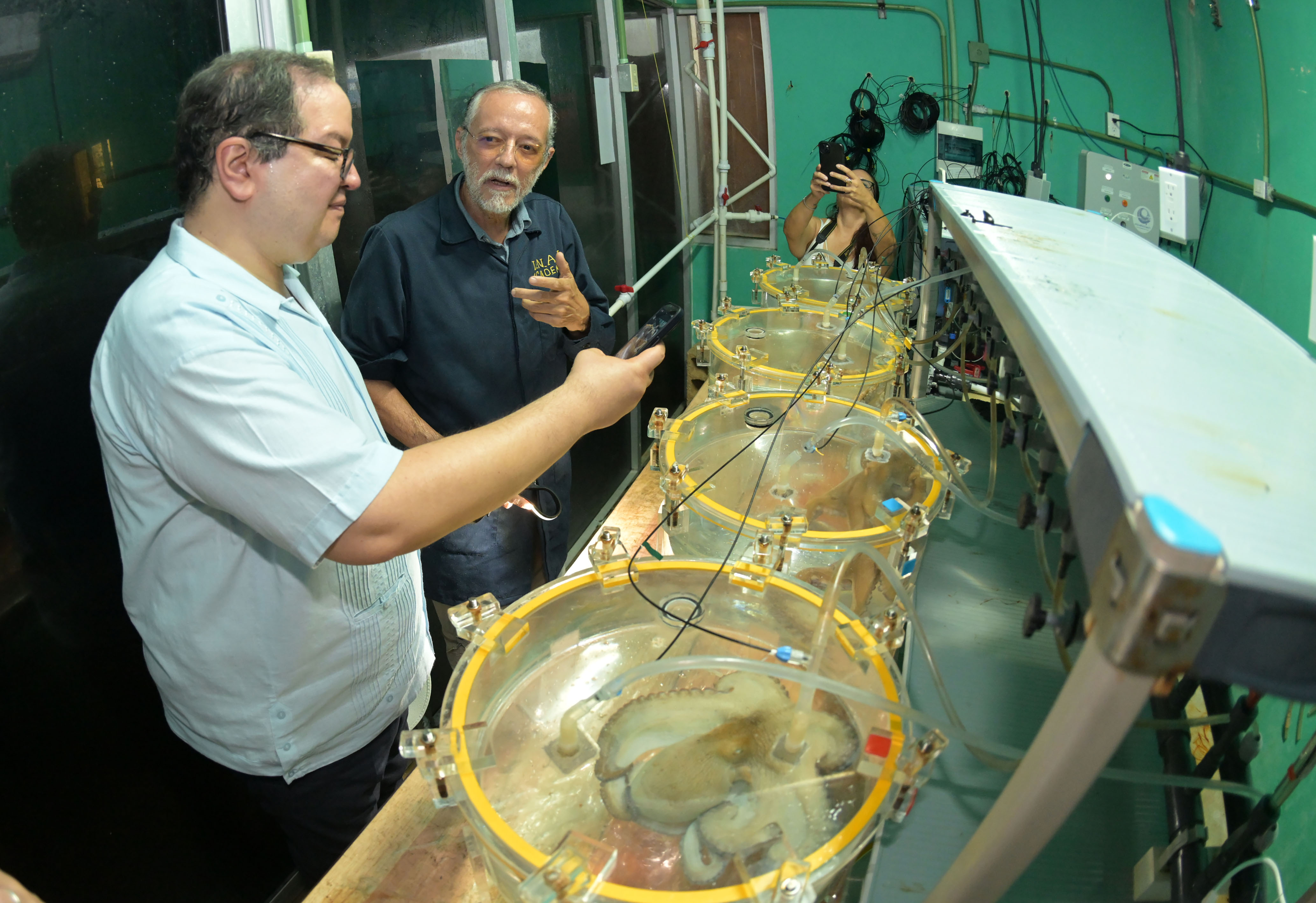 En la Unidad Sisal, el rector recorrió laboratorios de la Facultad de Ciencias donde se estudia la reproducción del pulpo y el calentamiento global. También visitó la Facultad de Química, donde se investigan moléculas bioactivas en la saliva y tinta de pulpo para nuevos fármacos.
