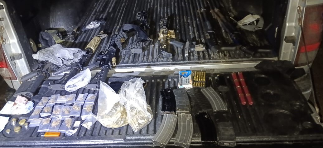 Los elementos de la Guardia Nacional y del Ejército Mexicano adoptaron los protocolos de seguridad correspondientes; les ordenaron que descendieran de la unidad y arrojaran al piso el armamento. Al verse superados, accedieron voluntariamente y fueron detenidos, asegurándose en el sitio lo siguiente:
