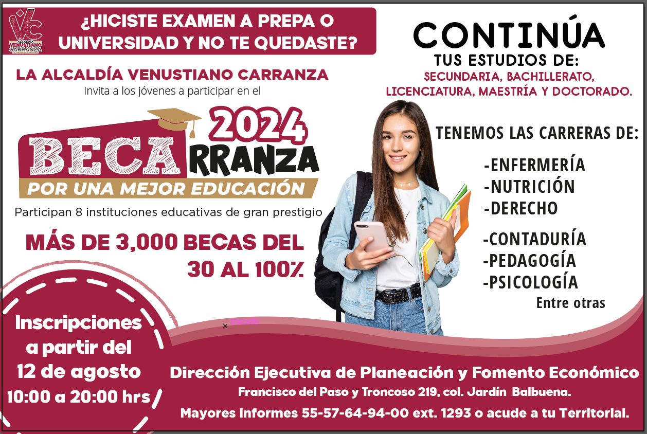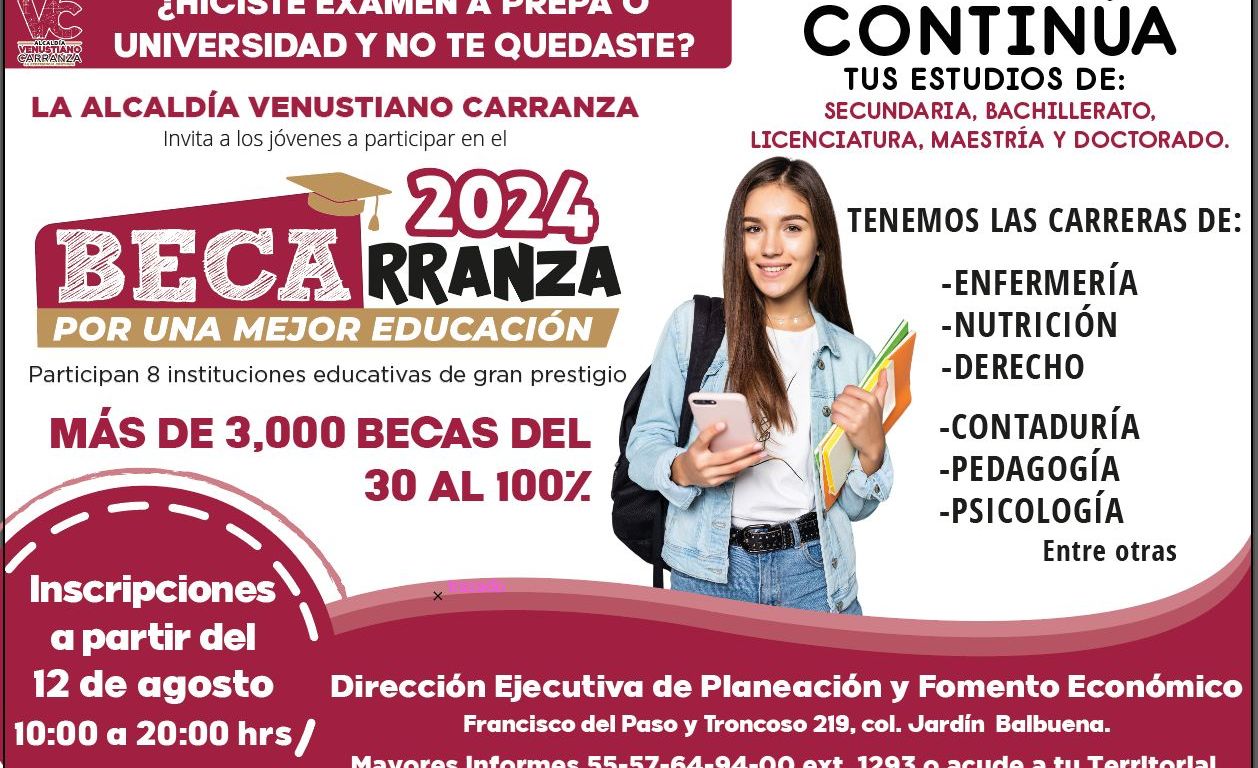 Si no te quedaste en la preparación o la universidad, el Alcalde de Venustiano Carranza, Adolfo Hernández García, anunció que este lunes inicia el registro para el programa “BeCarranza 2024 Por una Mejor Educación”, que ofrecerá becas del 30 y hasta el 100% para los jóvenes de la demarcación que no se quedaron en las instituciones de educación pública”.