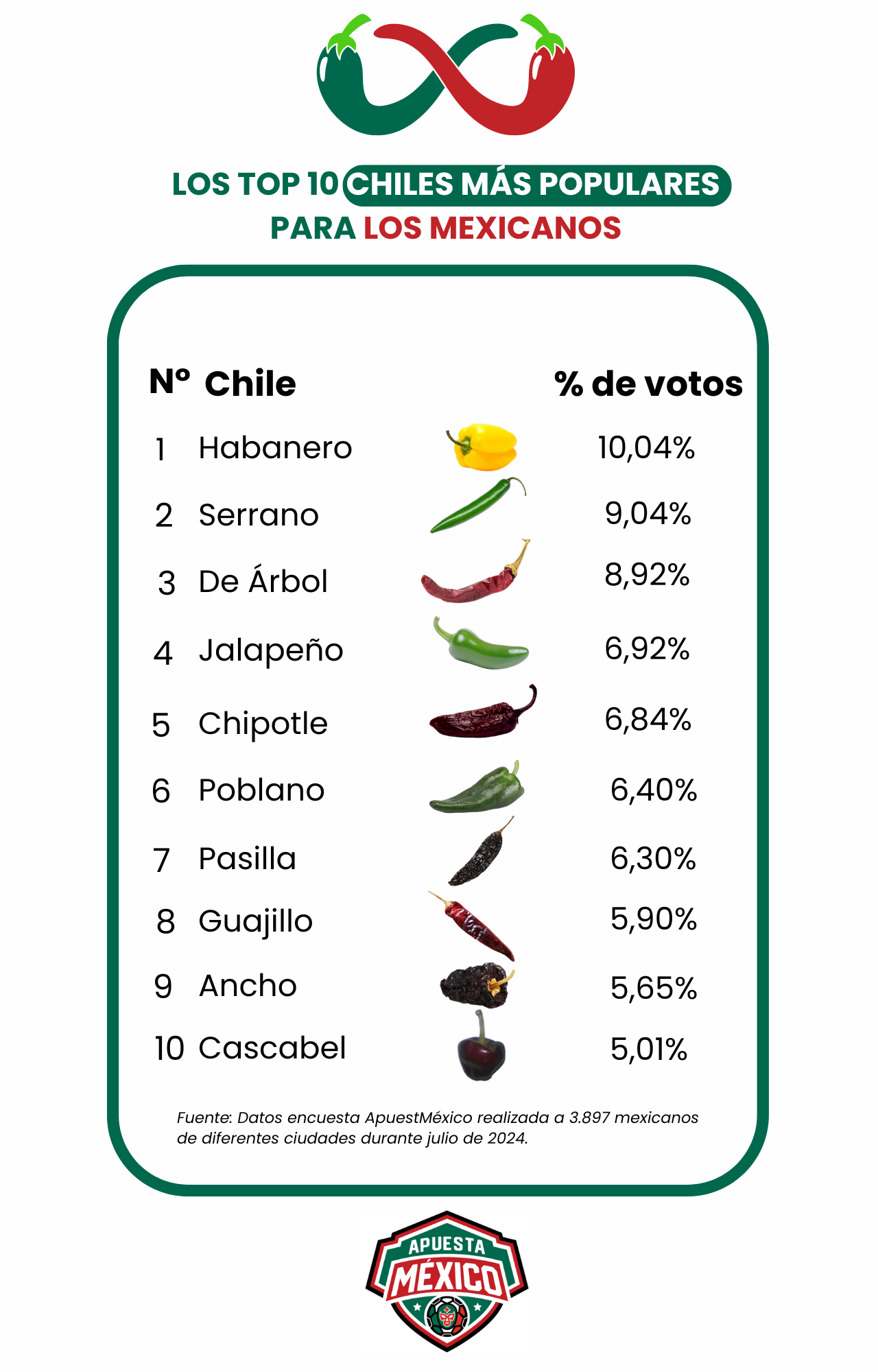 El chile, un ingrediente fundamental en la gastronomía mexicana, ha trascendido su papel culinario para convertirse en un símbolo de identidad nacional. Conociendo la importancia para nuestro país, ApuestaMéxico, la web más confiable de noticias sobre juegos de azar en línea, los mejores bonos e información legal sobre apuestas deportivas en México, ha decidido preguntarle a casi 4.000 mexicanos por cuál es su chile favorito. La encuesta realizada a nivel nacional, ha desvelado las preferencias picantes de miles de paladares.