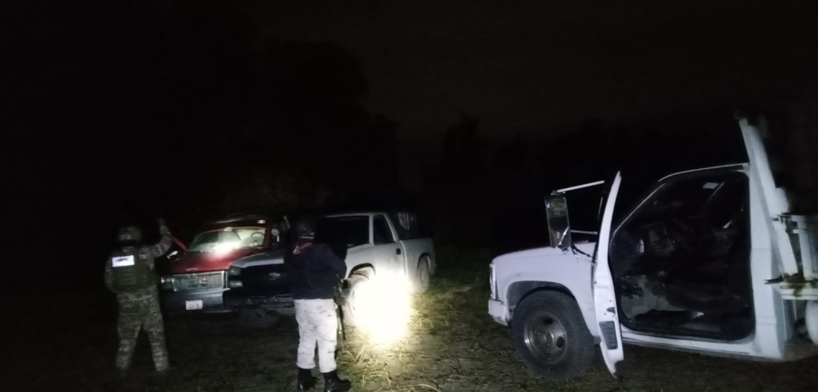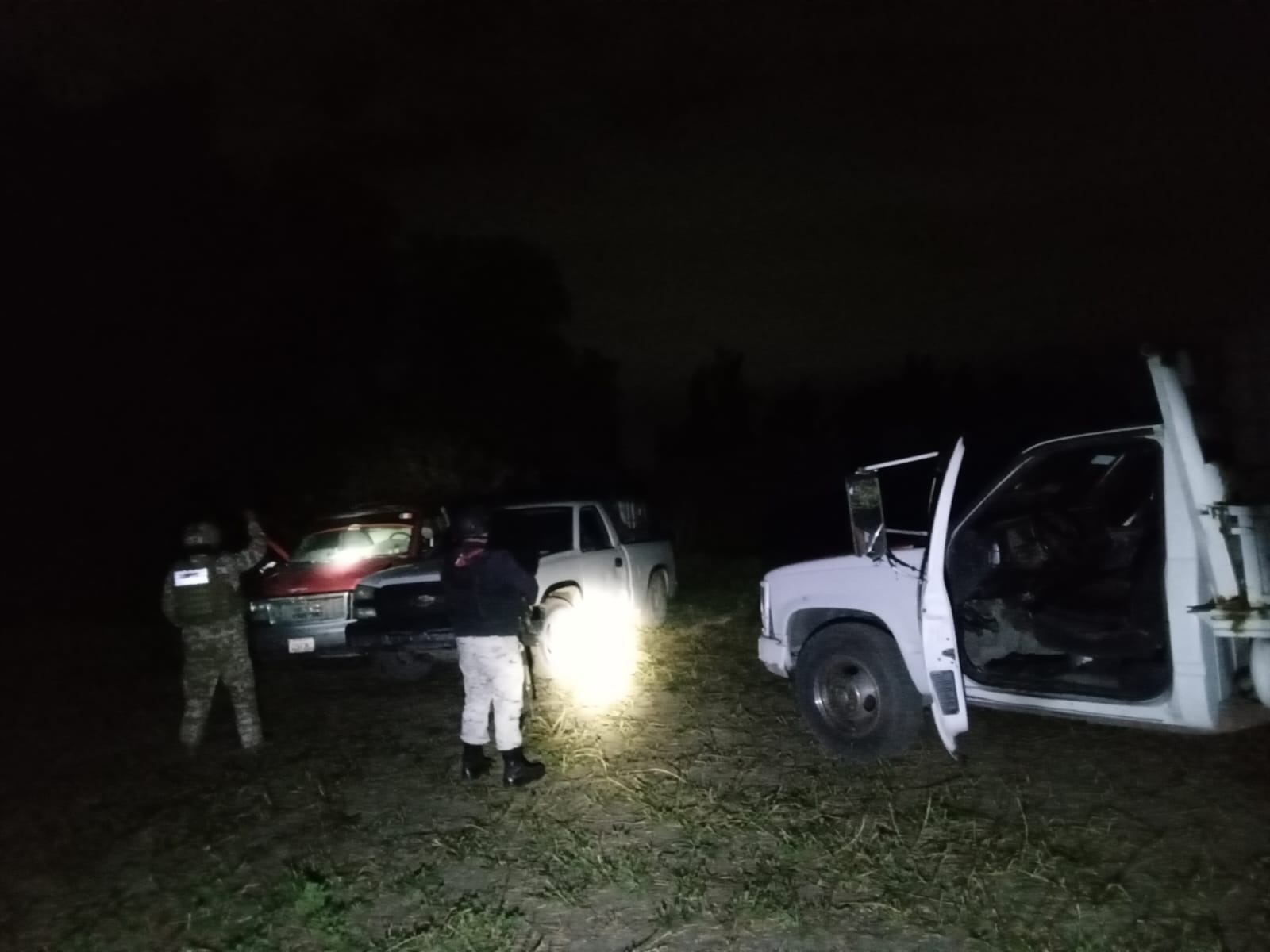 Al efectuar un reconocimiento en la zona, también localizaron tres camionetas abandonadas, las cuales despedían un fuerte olor a combustible, por lo que procedieron a inspeccionarlas.