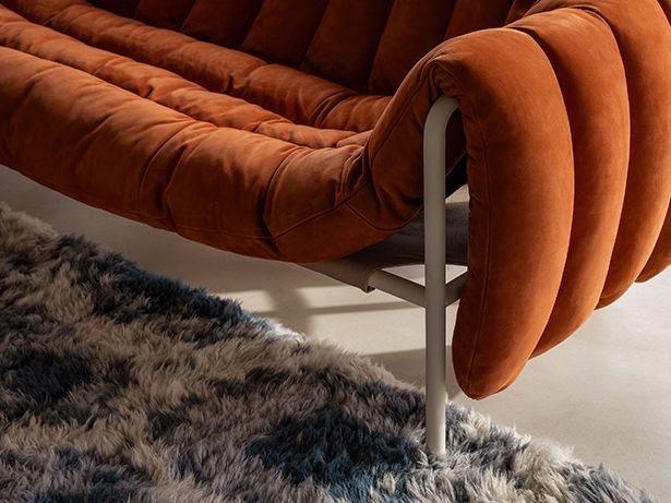 La colección Puffy se compone de dos elementos clave desde el punto de vista de su diseño, que se yuxtaponen de manera intencionada y divertida: un marco elemental de acero tubular inspirado en la estructura racional del diseño modernista clásico y un tapizado desmontable, grueso y mullido, tipo edredón, que se derrama libremente sobre los lados de la estructura metálica.
