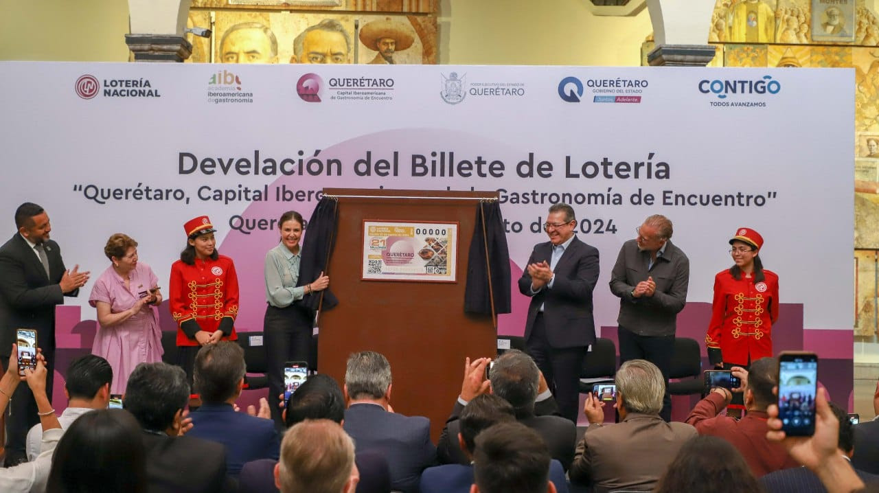 La titular de la Secretaría de Turismo del estado, Adriana Vega Vázquez Mellado, en compañía del director general de la Lotería Nacional para la Asistencia Pública, Marco Antonio Mena Rodríguez, develó el billete conmemorativo «Querétaro, Capital Iberoamericana de la Gastronomía de Encuentro».