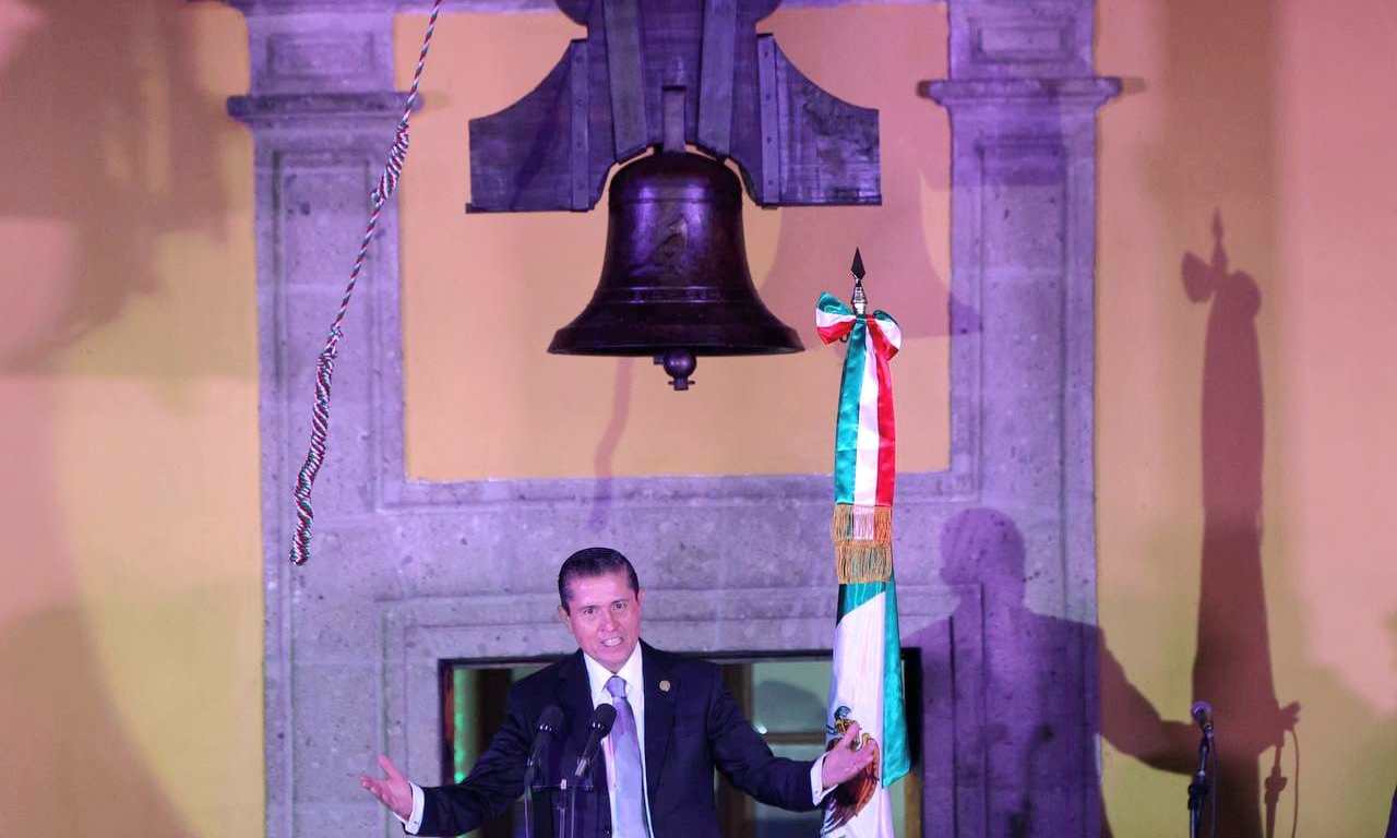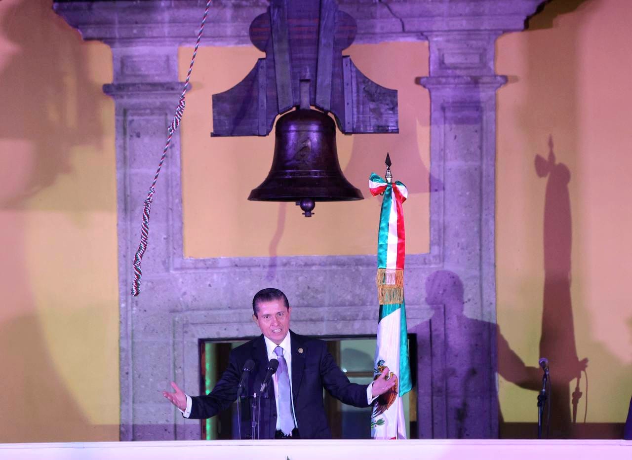 Acompañado por su familia, las ocho directoras y directores generales, así como por personalidades del ámbito político, cultural y deportivo, Giovani Gutiérrez salió al templete dispuesto en el Palacio de Cortés en donde tañó la campana en tres ocasiones para después soltar la arenga que los miles de asistentes, siguieron con el coro de ¡Viva México!