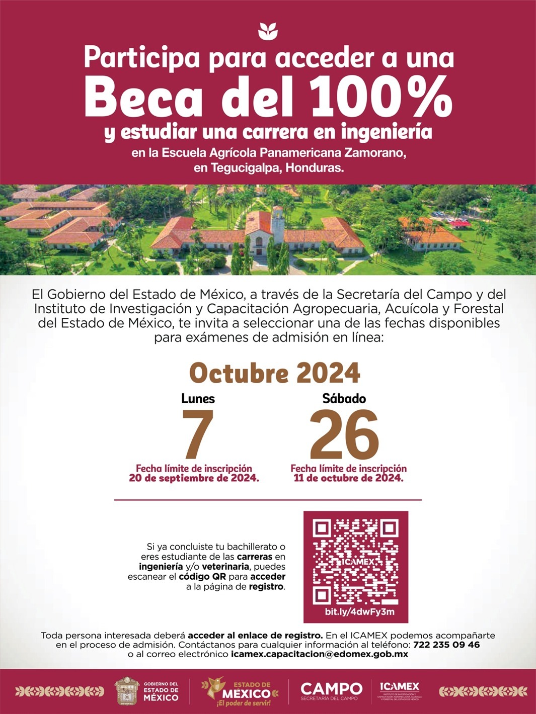 El gobierno del estado de México, por medio de la Secretaría del Campo y el Instituto de Investigación y Capacitación Agropecuaria, Acuícola y Forestal del Estado de México (Icamex), abrió la convocatoria para dos becas del 100%. Estas becas permiten a los estudiantes mexiquenses cursar sus estudios en la Escuela Agrícola Panamericana Zamorano, ubicada en Tegucigalpa, Honduras.