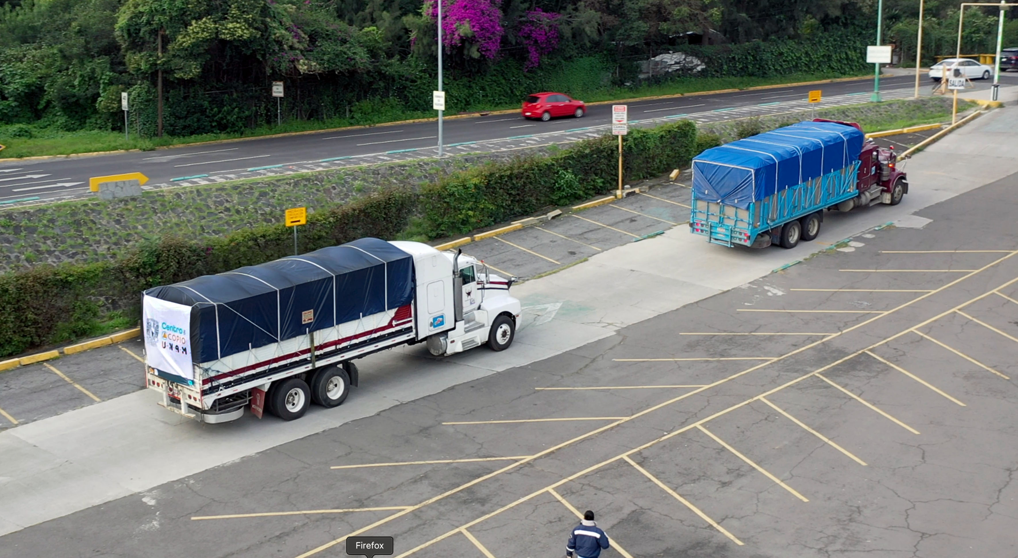Con el escudo universitario como insignia y la leyenda “Acopio UNAM Solidaria”, dos camiones, cada uno con 20 toneladas de ayuda humanitaria, salieron esta mañana rumbo al estado de Guerrero.