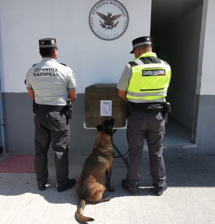 En San Luis Potosí, perros de la Guardia Nacional (GN) detectaron 19 paquetes de posible marihuana en una empresa de mensajería.