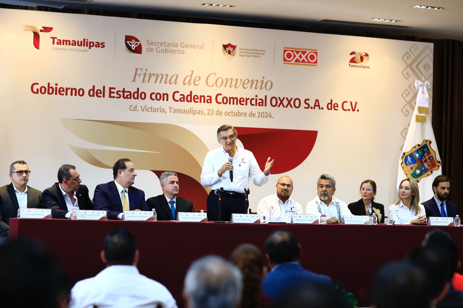 “En nombre de todos los que formamos la gran familia Oxxo quiero agradecer al doctor Américo Villarreal Anaya, gobernador de Tamaulipas, por su disposición y compromiso en garantizar condiciones de seguridad en el estado”, dijo.