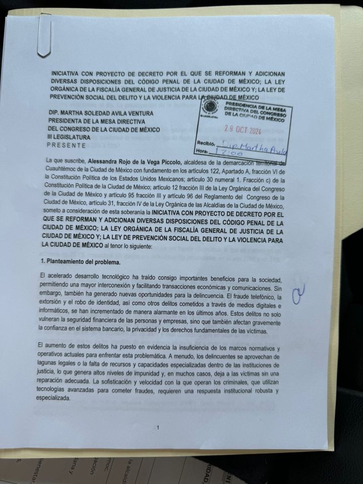 Como parte del «Plan Cuauhtémoc Libre de Extorsión», la alcaldesa de Cuauhtémoc, Alessandra Rojo de la Vega Piccolo, presentó una iniciativa en el Congreso de la Ciudad de México, para aumentar las penas para quien o quienes cometan extorsiones a través de llamadas telefónicas o medios digitales, con lo que no solo busca beneficiar a las y los habitantes de la alcaldía, sino también a todos los capitalinos.