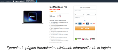 Una de estas campañas de estafa se difunde a través de correos electrónicos, atrayendo a posibles víctimas con una oferta exclusiva para probar una nueva versión del MacBook, cuyo lanzamiento está previsto para noviembre. El correo contiene un enlace que, al acceder, redirige al usuario a una página web diseñada para imitar un mercado legítimo, prometiendo un portátil de prueba por tan solo 13 dólares, a cambio de proporcionar comentarios para mejorar el dispositivo. Para reclamar la oferta, los usuarios deben completar un formulario que solicita información sensible, incluyendo su nombre, dirección completa, número de teléfono y correo electrónico. Después de enviar los datos de contacto, se pide la información de la tarjeta de crédito para comprar el MacBook al precio exclusivo de prueba.