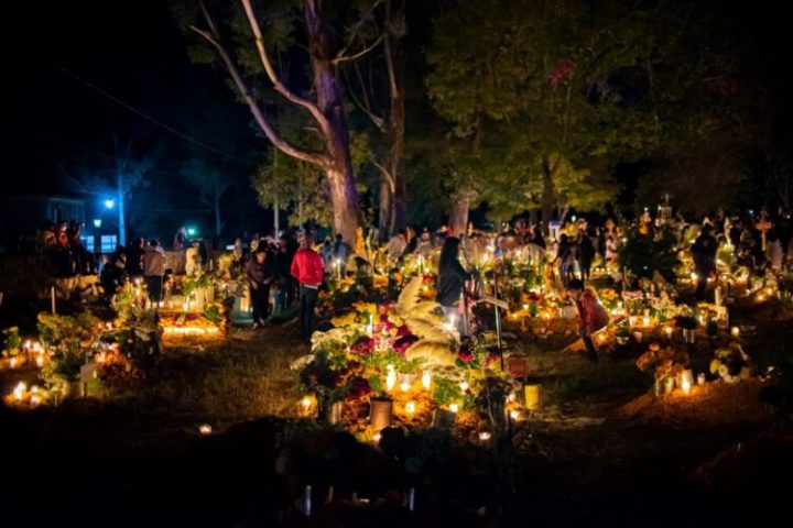 Cada noche del 1 de noviembre, habitantes y turistas llegan al cementerio de Pátzcuaro con ofrendas para honrar a los difuntos. Las tumbas se iluminan con velas que guían el camino de las almas en su visita a la tierra.