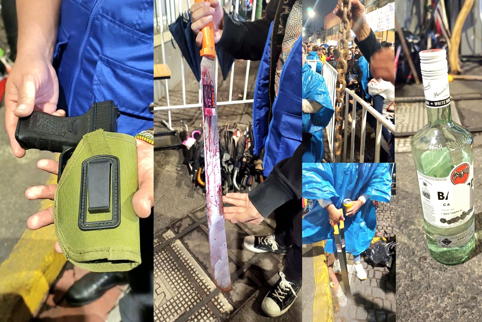 En estos filtros se retuvieron varios machetes, cuchillos de diversa índole, navajas, palos, cadenas de diversos tamaños, motosierras sin cadenas, varios tipos de bebidas alcohólicas en botella o latas, palos, varas, bats con púas e incluso armas no letales de aire como una pistola y un rifle, con los cuales no se permitió el acceso y cuyos propietarios accedieron a dejarlos por seguridad de todos.
