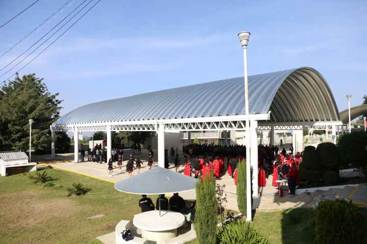 El mandatario inauguró en San Miguel Canoa la construcción de los techados de las plazas cívicas en la secundaria y el preescolar del Centro Escolar “Coronel Raúl Velasco de Santiago”