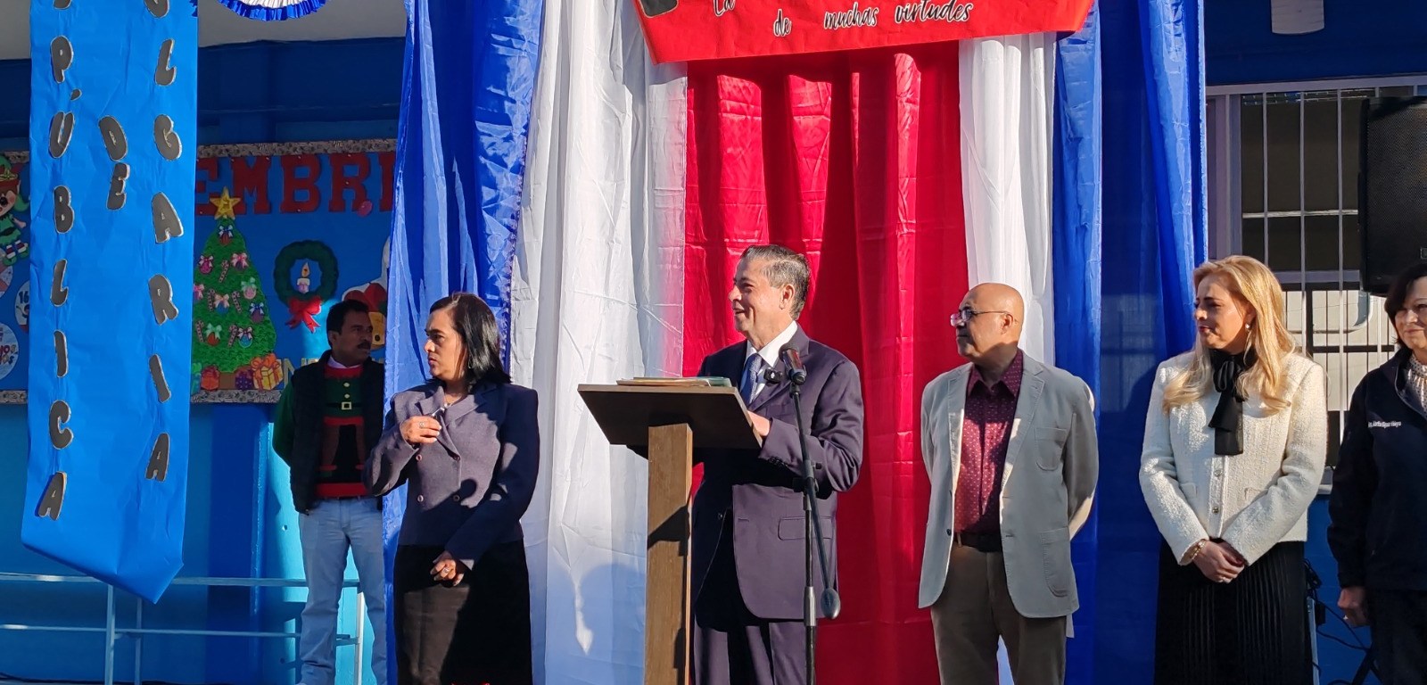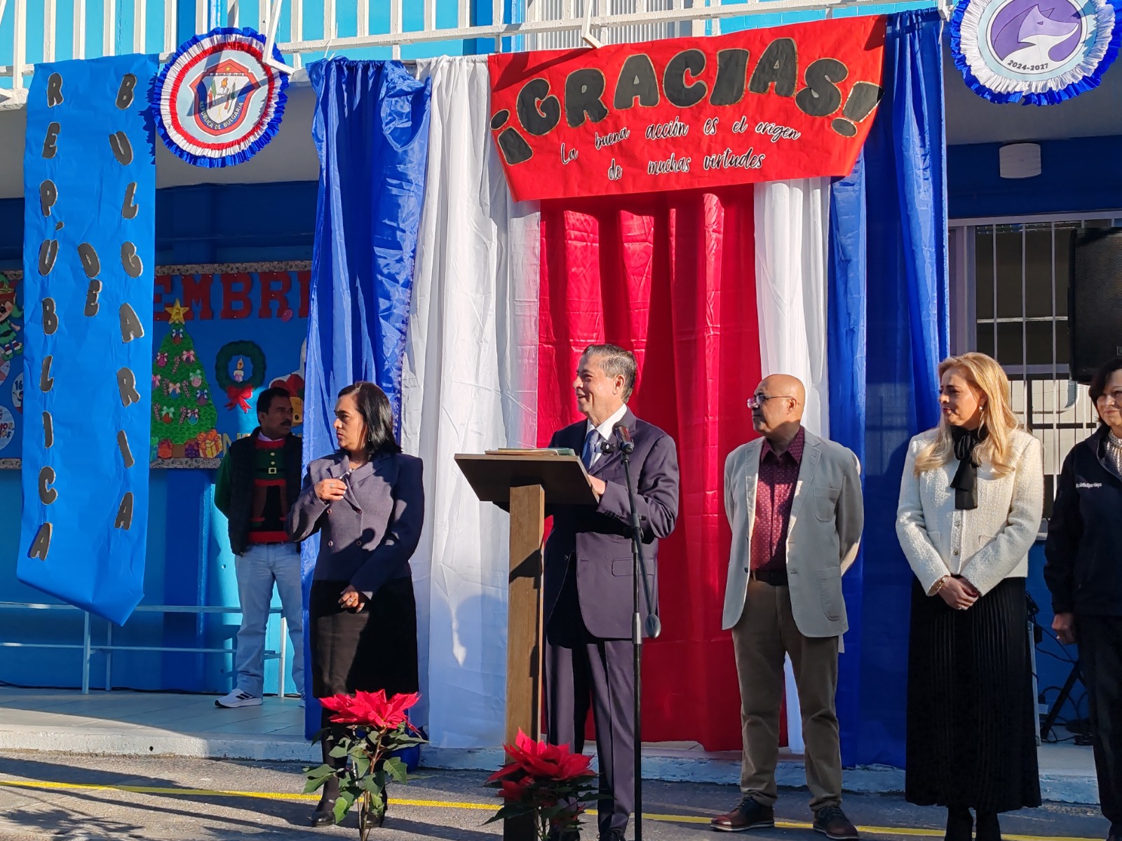 Luego de realizarse la ceremonia cívica de honores a la bandera, acompañado por la directora del plantel, Patricia Garduño, el encargado de asuntos culturales de la Embajada de Bulgaria, Tsvetomir Hristov; la supervisora escolar Rosa María Trinidad Salazar, así como por estudiantes, madres y padres de familia, el alcalde indicó: