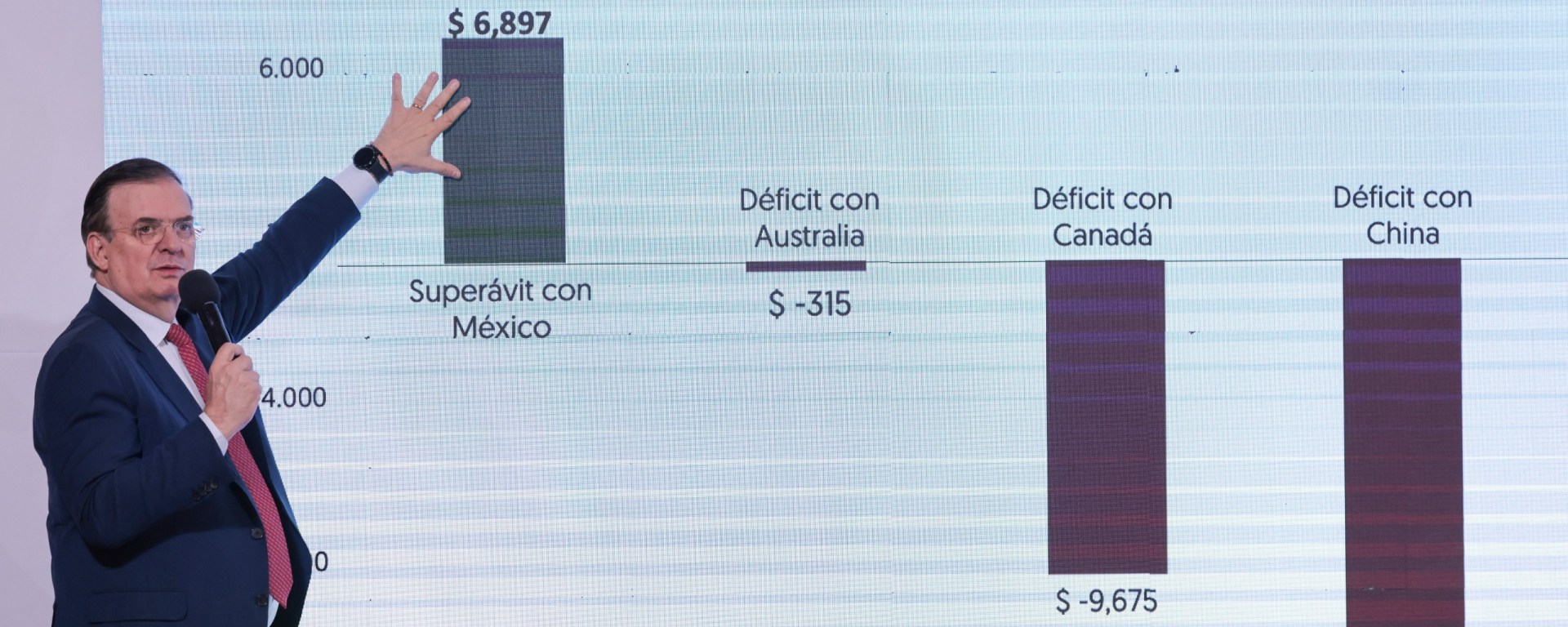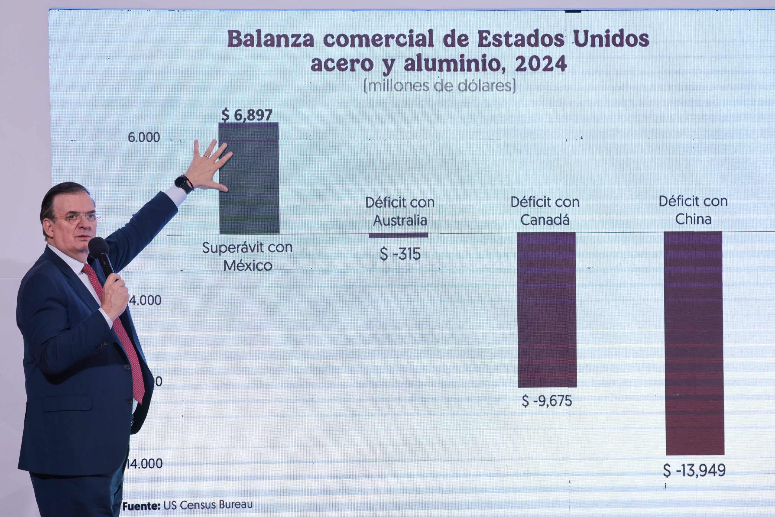 El secretario de Economía, Marcelo Ebrard Casaubón, rechazó la decisión del presidente de Estados Unidos, Donald Trump, de imponer un arancel del 25% al acero y aluminio mexicanos. Aseguró que la medida es injusta e ilógica, pues México importa más de lo que exporta a su vecino del norte.