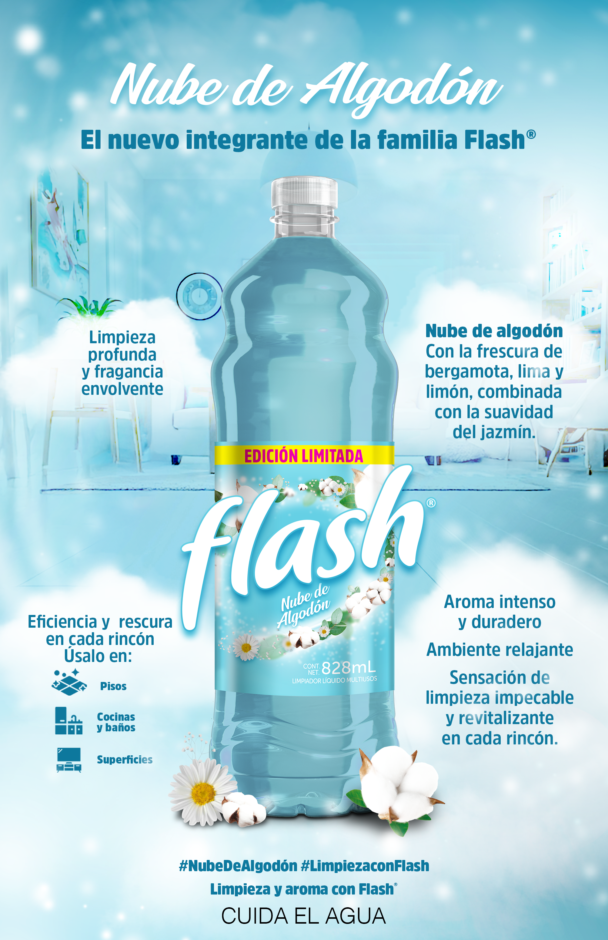 Flash, limpiador multiusos y producto de confianza para la limpieza en el hogar. Cuenta con deliciosos aromas para el olfato como: lavanda, brisa marina, floral y ahora presenta su nuevo aroma Nube de Algodón
