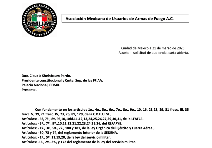 La Asociación Mexicana de Usuarios de Armas de Fuego A.C. (AMUAF-AC) solicitó a la presidente Claudia Sheinbaum Pardo una audiencia para discutir reformas en materia de posesión y portación de armas en México. En una carta, cuya copia posee SOCIEDAD NOTICIAS la organización planteó su oposición a la iniciativa de reforma impulsada por el gobierno federal.