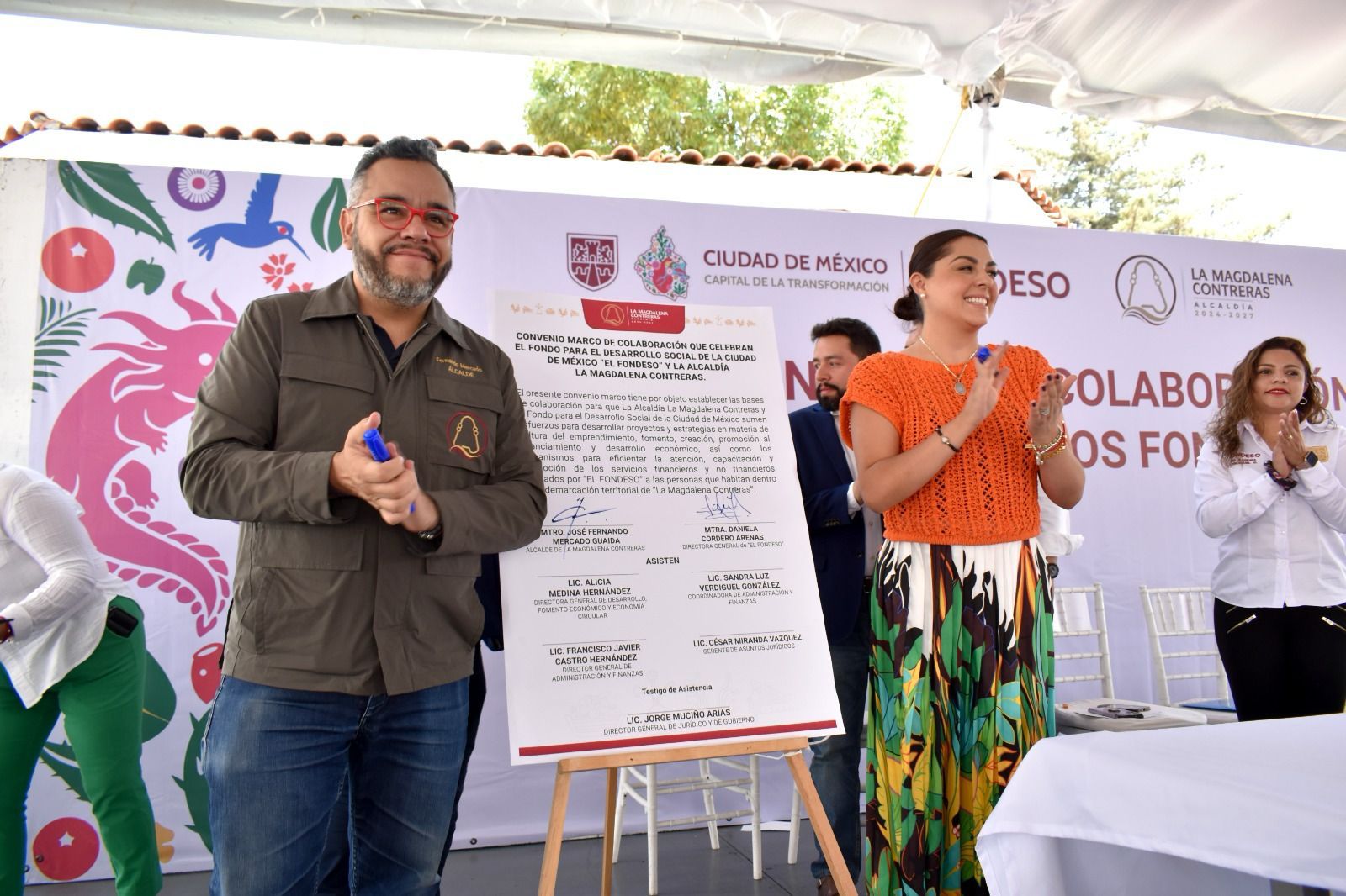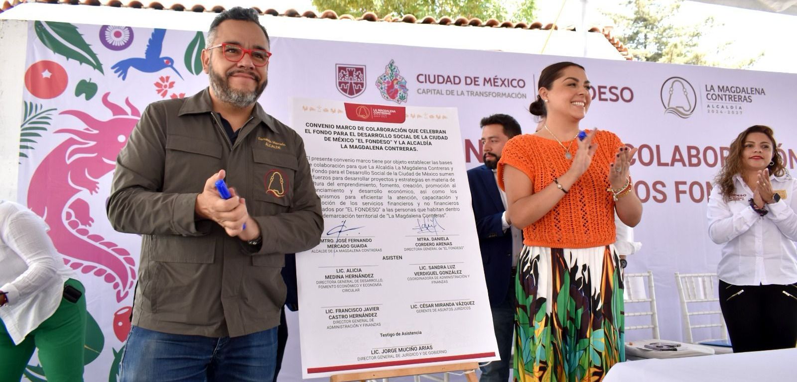Durante el evento realizado en la explanada de la alcaldía, se firmó un convenio de colaboración entre la Alcaldía La Magdalena Contreras y el FONDESO, con la finalidad de desarrollar proyectos y estrategias en materia de cultura del emprendimiento, fomento, creación, promoción al financiamiento y desarrollo económico.