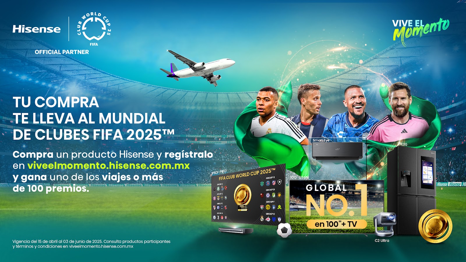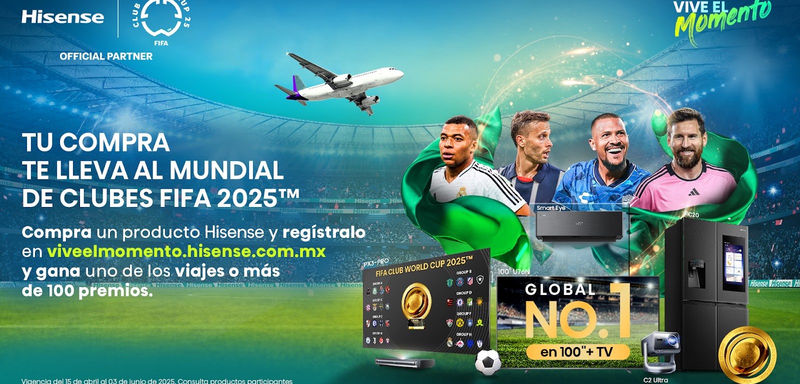 Hisense, empresa líder mundial en tecnología de consumo y patrocinador oficial del Mundial de Clubes FIFA 2025™, ha lanzado la nueva promoción “Vive el Momento con Hisense” para los consumidores mexicanos, quienes podrán participar para ganar más de 100 premios, entre ellos, 30 viajes a un partido del Mundial de Clubes, 20 televisores, 5 proyectores Laser 4K, 10 frigobares, 25 barras de sonido y productos del certamen, como jugadoras del Real Madrid, del Inter Miami y balones de juego.
