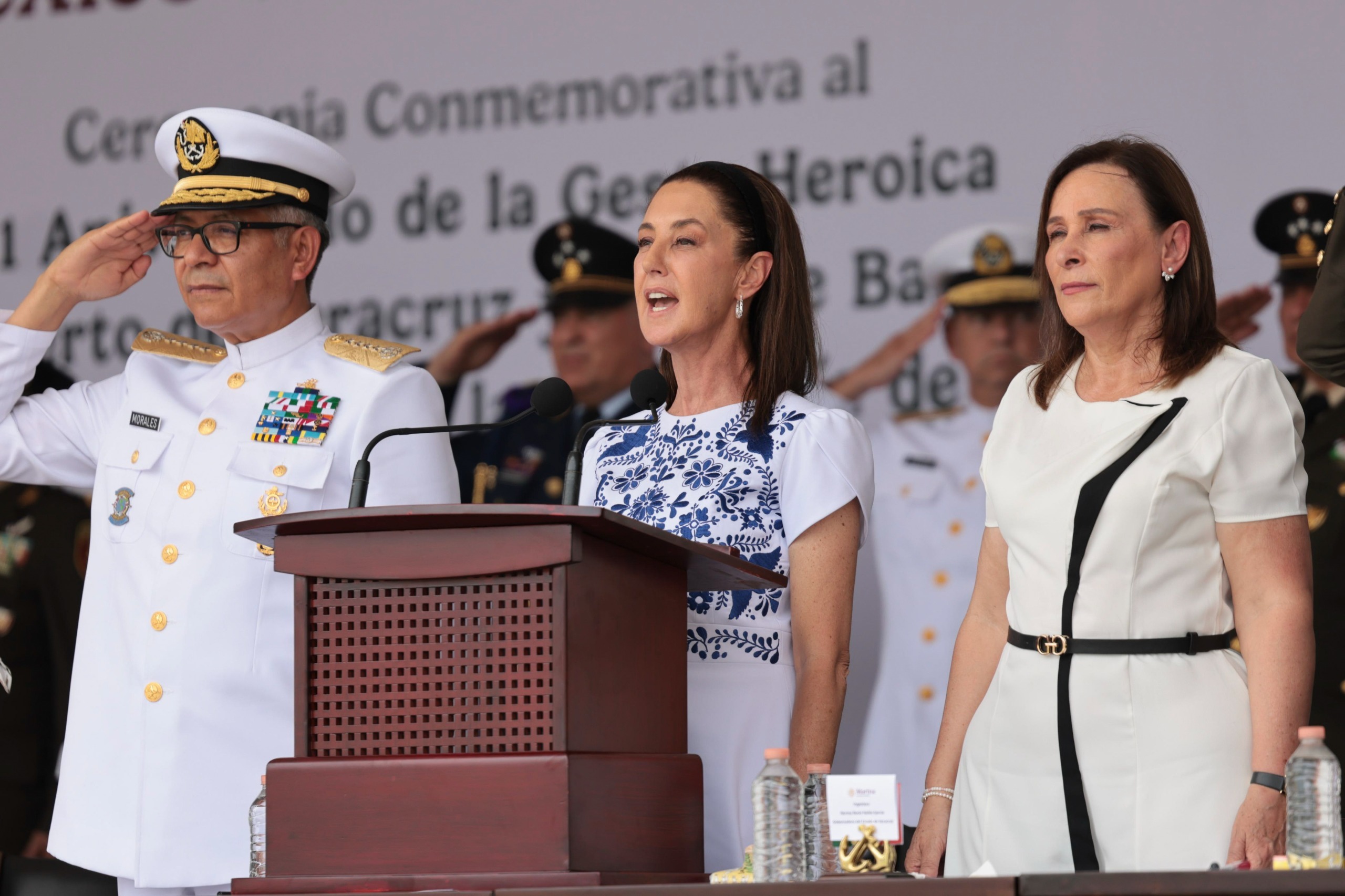 “México no es protectorado ni colonia de país alguno. Somos una nación libre, independiente y soberana”, expresó durante el acto conmemorativo frente a elementos de la Marina Armada.