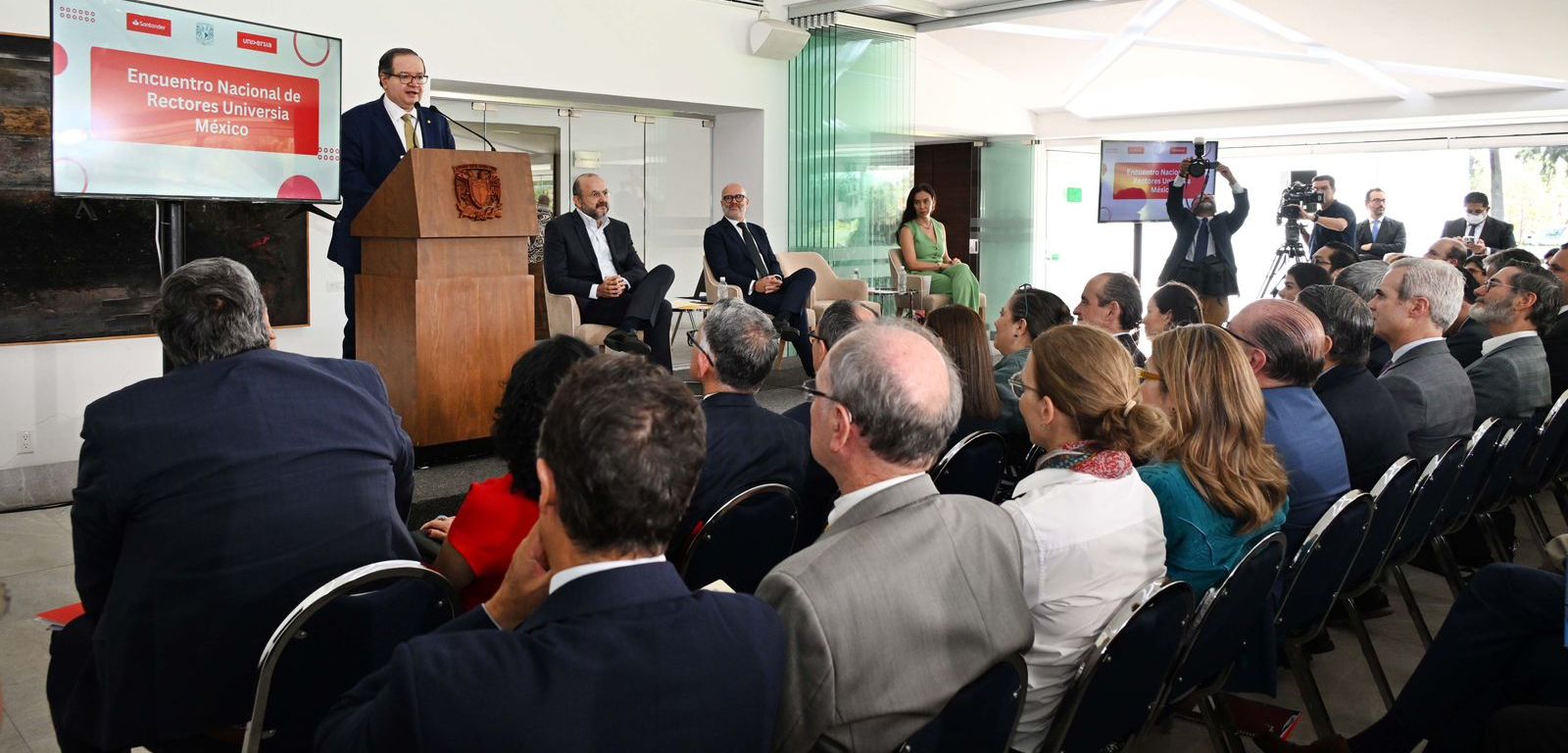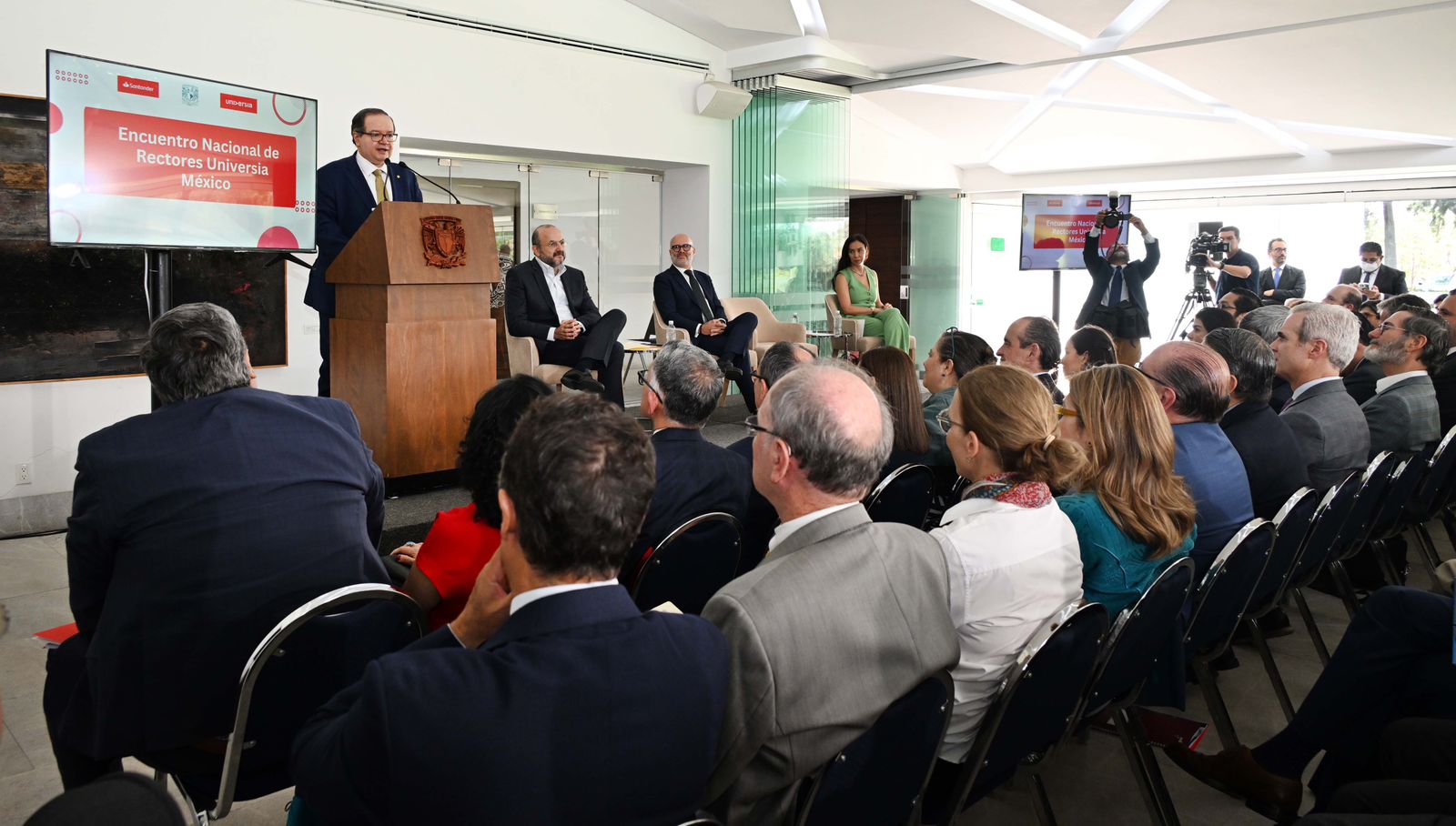En el Encuentro Nacional de Rectores Universia México, que tuvo el objetivo de impulsar una reflexión profunda sobre los retos y oportunidades de la educación superior en México en un contexto de transformación social y tecnológica, se reunieron 114 rectoras, rectores y representantes de instituciones de educación superior del país, así como la subsecretaria de Educación Media Superior, Tania Rodríguez Mora; el subsecretario de Educación Superior, Ricardo Villanueva Lomelí; y el Director General de Santander México, Felipe García Ascencio, donde el rector de la UNAM indicó que esta es una cita institucional para repensar el futuro de la educación superior y su vinculación con la educación media superior, con la certeza de que los retos más urgentes solo pueden afrontarse mediante la cooperación, la deliberación crítica y la acción colectiva.