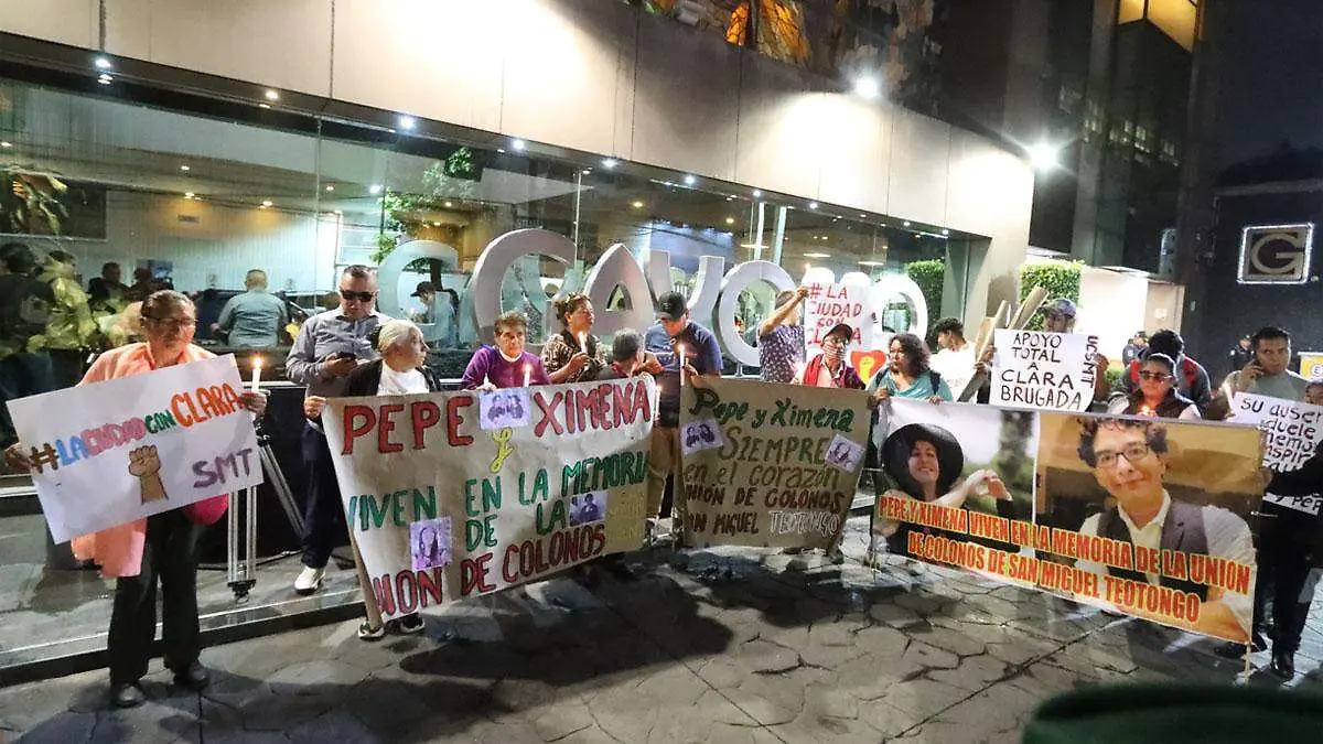 Un grupo de colonos de San Miguel Teotongo llegó con carteles que expresaban respaldo a Clara Brugada. Las leyendas decían: “Apoyo total, la Ciudad con Clara” y “Viven en la memoria de la Unión de Colonos”. En silencio, permanecieron a las afueras de la funeraria en señal de respeto.